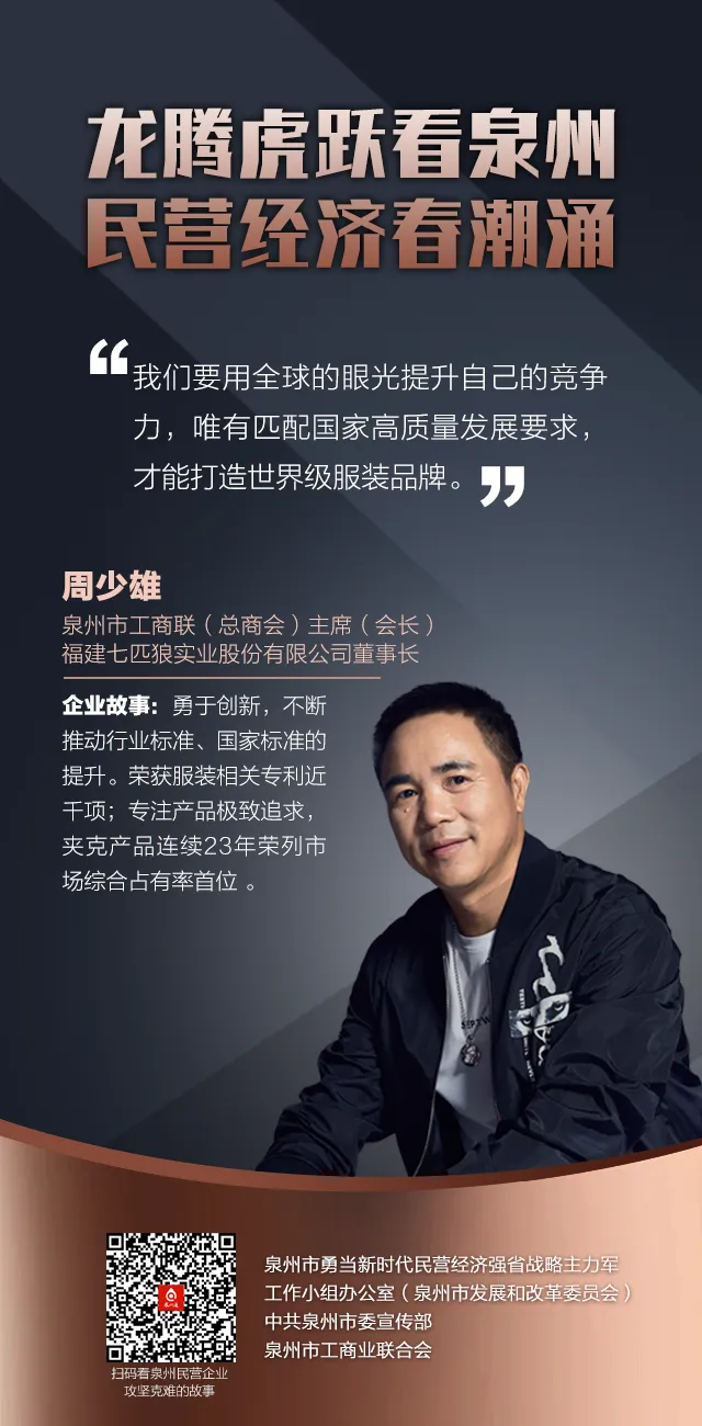 “今年全国两会,政府工作报告体现了党和政府对民营经济和民营企业的重视和扶持。2024年,我们要让大家看到,七匹狼依然是那头勇往直前、向前飞奔的狼。”作为泉州民营企业的代表之一,福建七匹狼实业股份有限公司凭借“敢为天下先”的精神,领跑行业取得突破式发展。中国服装业首家上市公司、首家受到米兰时装周官方邀请走秀的中国男装品牌、“夹克之王”……一系列含金量十足的名片,是对企业高质量发展最好的注解。
