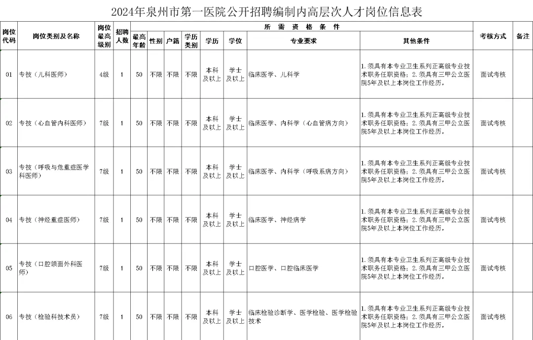 泉州市第一医院公开招聘编制内高层次人才6人