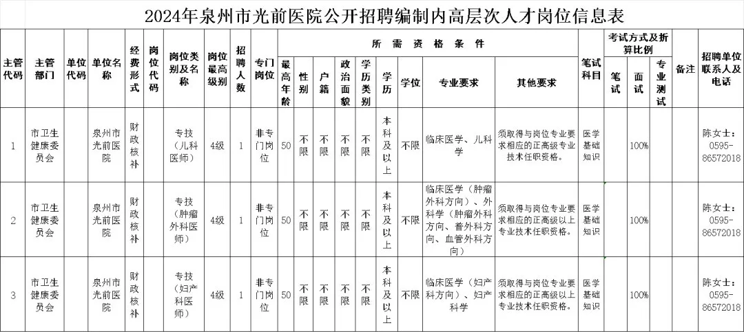 泉州市光前医院公开招聘编制内高层次人才3人
