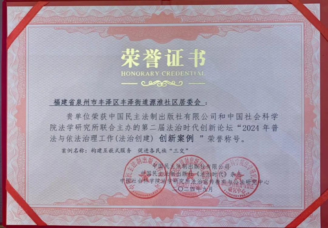 泉州市丰泽区丰泽街道源淮社区居委会报送的《构建“互嵌式”社区环境 促各民族“三交”》案例获评“2024年普法与依法治理工作创新案例”荣誉称号。
