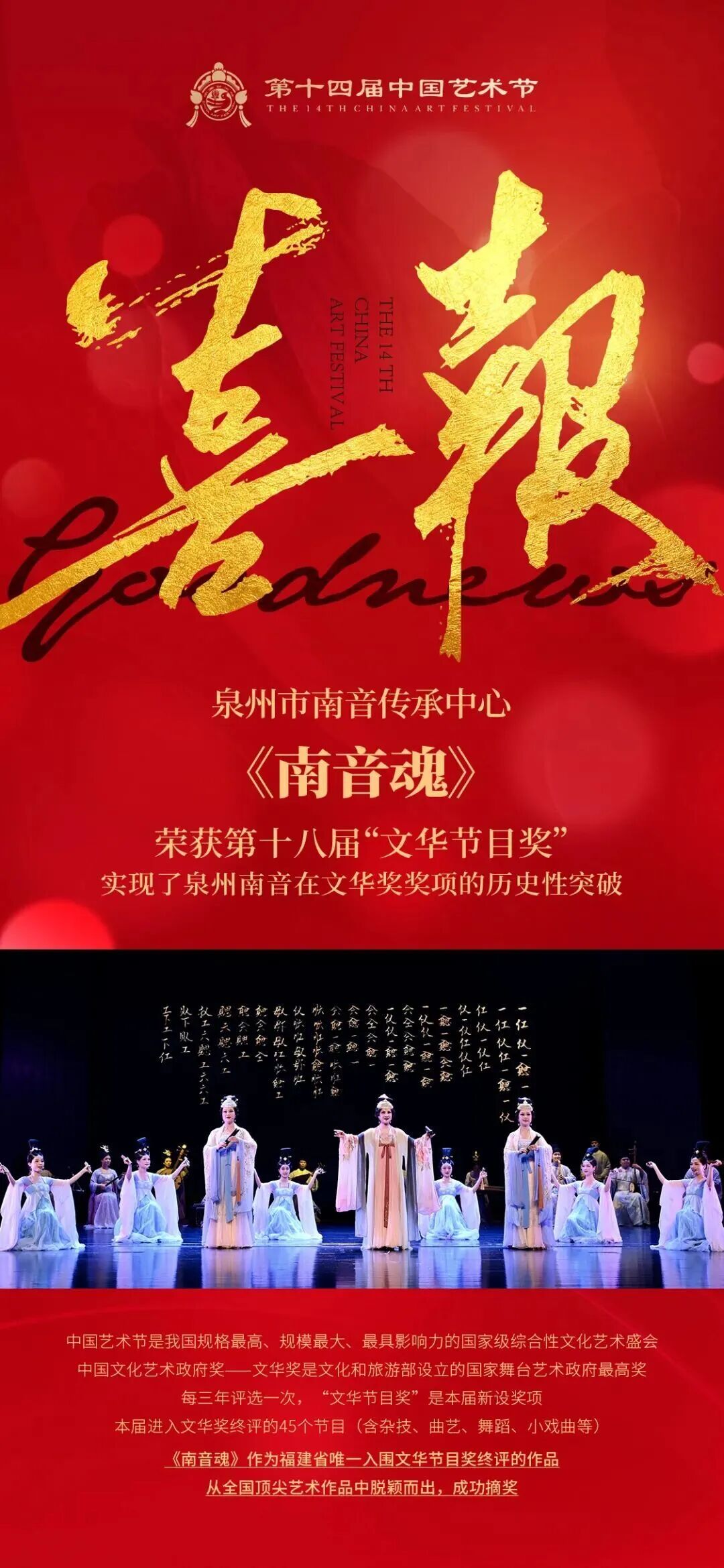 11月4日晚,由文化和旅游部主办的第十四届中国艺术节胜利闭幕,活动进行了第十八届文华奖的评选。由福建省文化和旅游厅和泉州市文化广电和旅游局组织选送,泉州市南音传承中心创排的南音《南音魂》,成功斩获第十八届“文华节目奖”, 这是我市继2013年获奖后,时隔12年再获中国文华奖殊荣,也是泉州南音首次摘得该项国家级最高荣誉,既彰显了“中国音乐活化石”在当代传承创新的深厚实力,也进一步巩固了福建作为非遗大省在全国舞台艺术领域的重要地位。