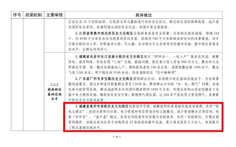 福建省泉州市西街历史文化街区创新技术手段,破解狭窄街巷基础设施改造难题。采用“管线立排法”,把雨水管和污水管、电力管道和电信管道分别立排敷设,减少管道横向占用空间。创新“井中井”“盖中盖”做法,在雨水沟检查井内设置污水检查井,共用一处检修位,方便后期管网维护。该做法成功应用于西街周边29条街巷的提升改造,累计惠及居民2万余人,有效提升了街区基础设施水平。