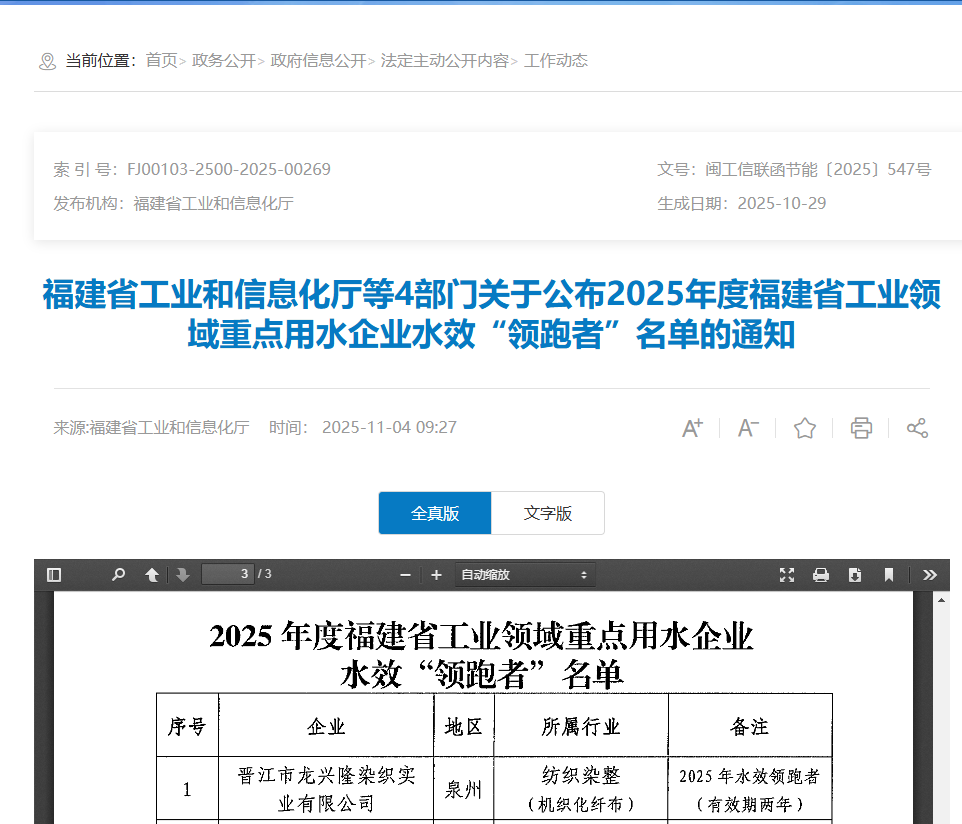 近日,福建省工信厅等四部门公布2025年度福建工业领域重点用水企业水效“领跑者”名单,我市的晋江市龙兴隆染织实业有限公司上榜。