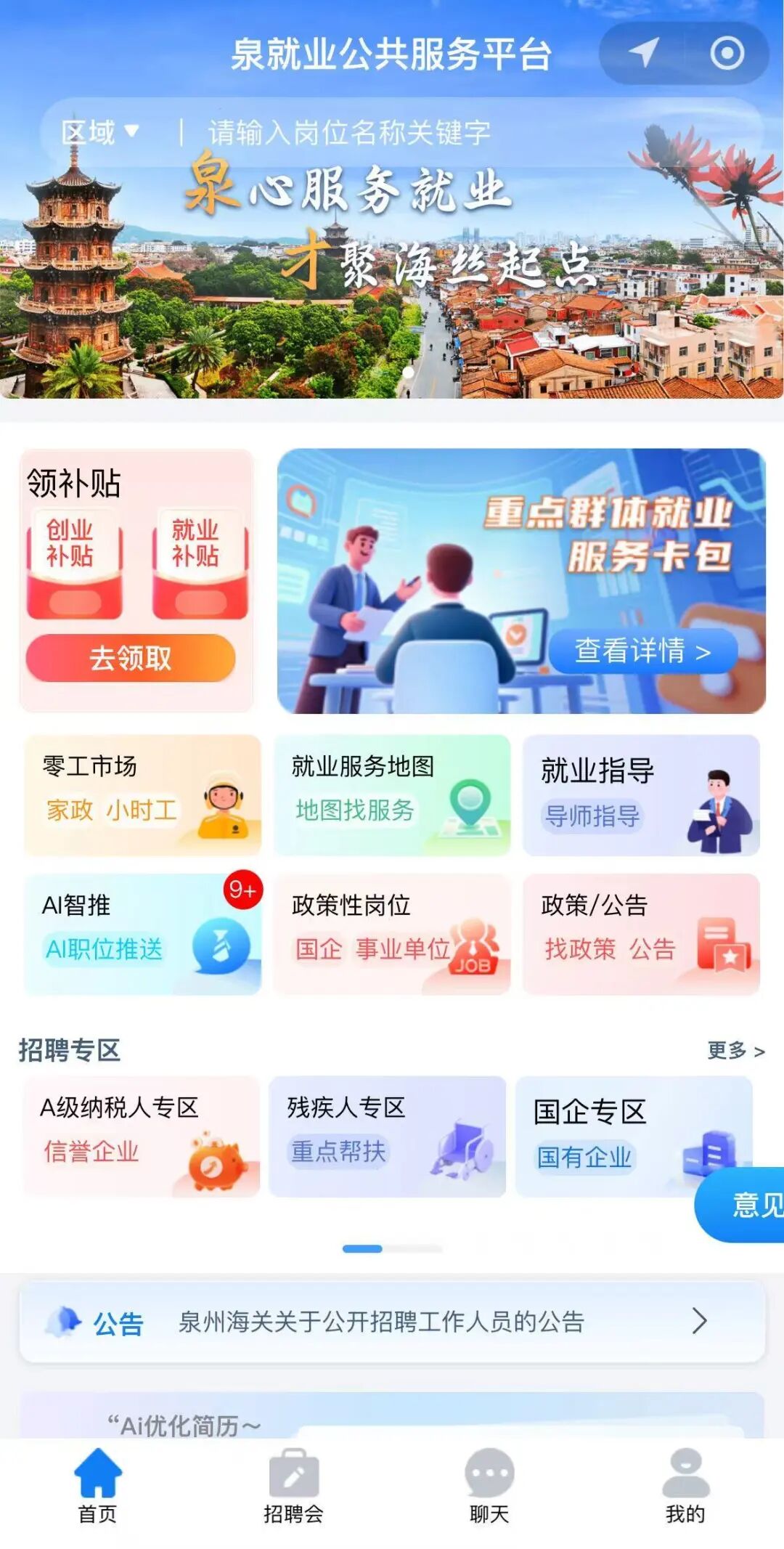 如今,无论是应届毕业生、退役军人,还是寻求零工机会的“宝妈”,只需在微信搜索“泉就业公共服务平台”完成一次注册,即可体验全新的就业服务。大学生可领取“大学生服务卡”,享受精准岗位推荐、职业测评和专属政策直达;求职者能通过“智能推荐”“离我最近”等功能,快速锁定心仪工作;企业用户可一键发布岗位、搜索人才、参加线上招聘会,高效完成用工管理。这一机制实现了“让数据多跑路,让群众少跑腿”,构建起一个响应迅速、服务精准的就业服务新生态。
