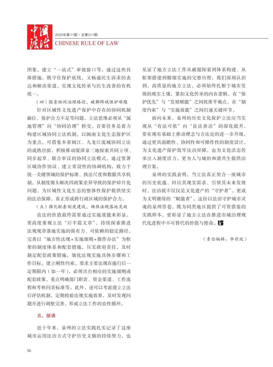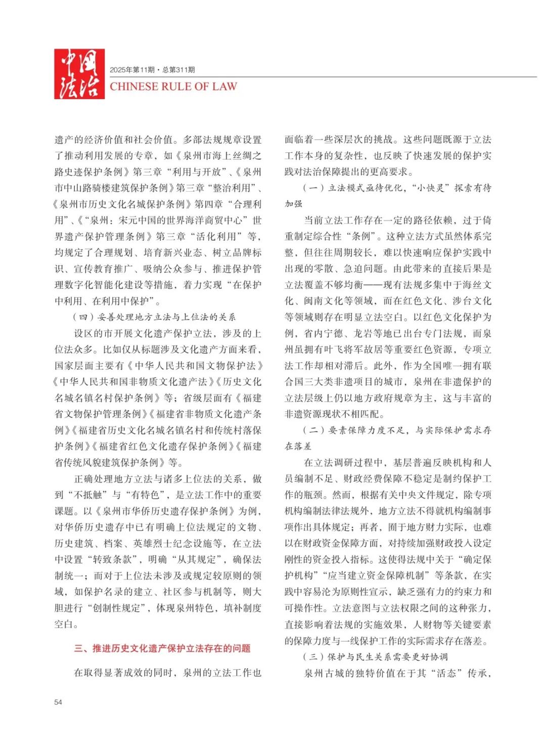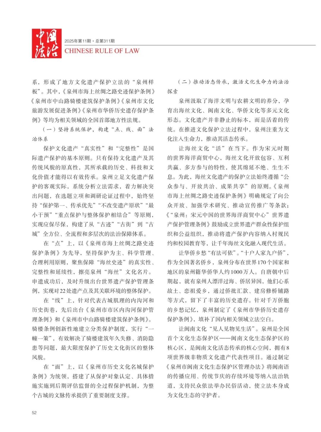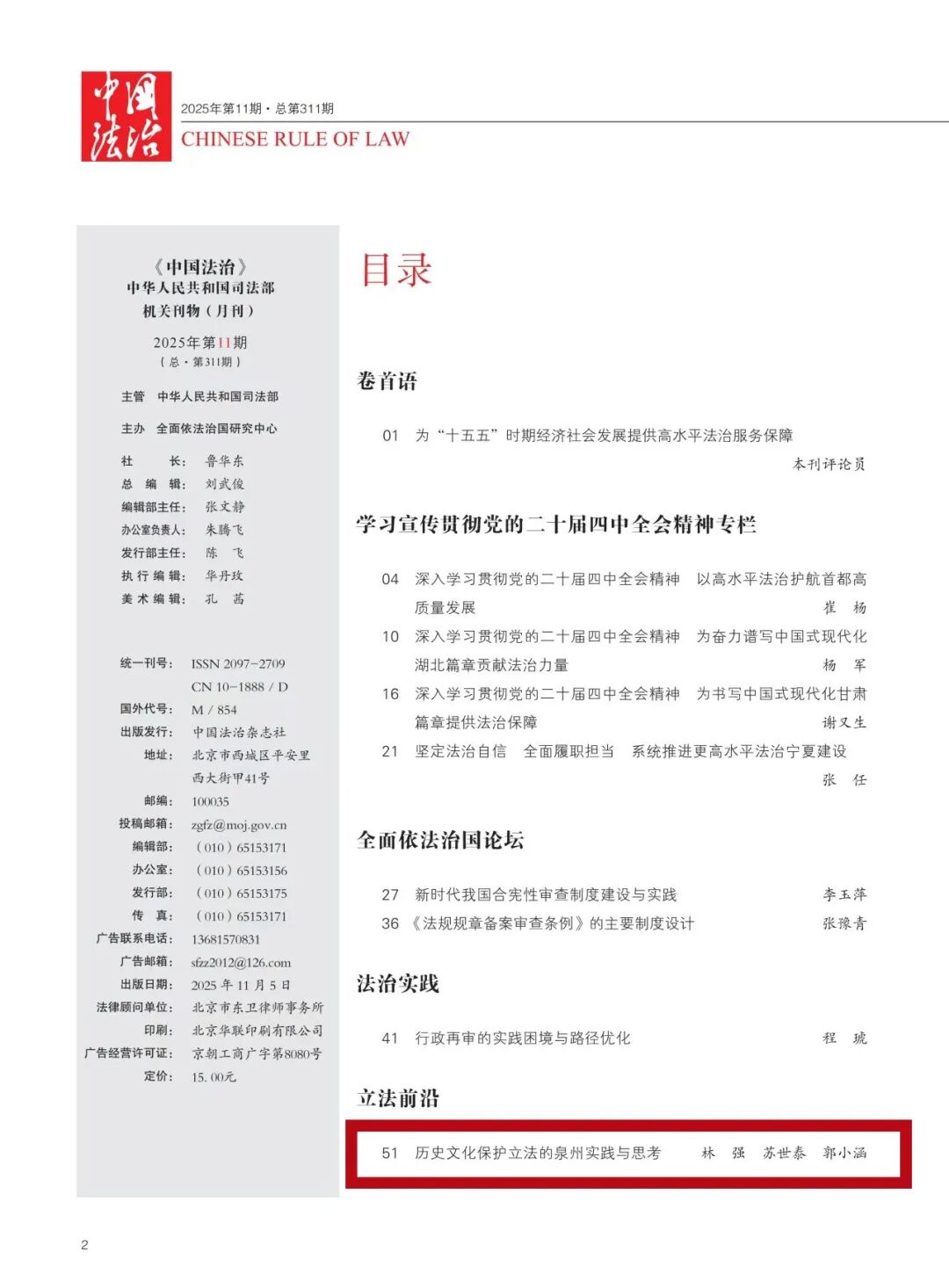 近日,由泉州市司法局调研组撰写的《历史文化保护立法的泉州实践与思考》一文,在司法部机关刊物《中国法治》2025年第11期正式刊发。