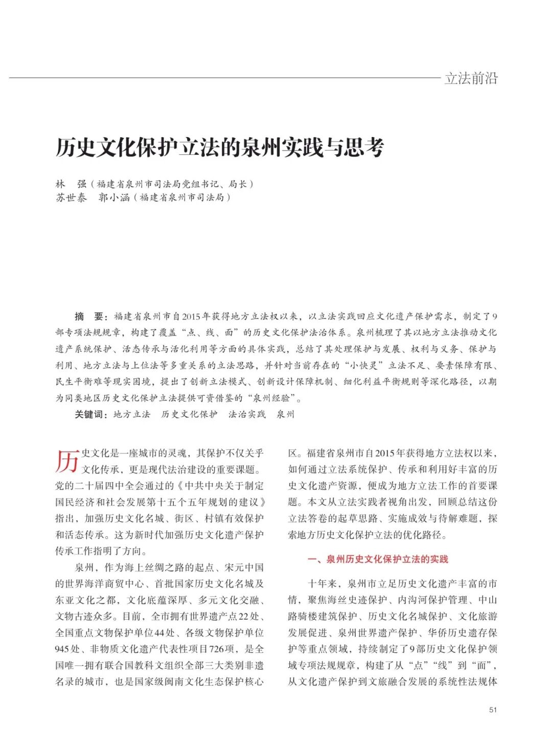 此次获刊,既是对我市十年立法工作成果的集中展示,也标志着泉州在历史文化保护领域的法治实践获得了国家层面专业平台的高度认可。作为政府立法工作的统筹部门,泉州市司法局始终坚持围绕中心、服务大局,在十年立法实践中不断积累经验、凝练特色,推动立法与城市发展深度融合,将法治软实力持续转化为发展硬支撑,以高质量的法治保障护航“海丝名城”建设。