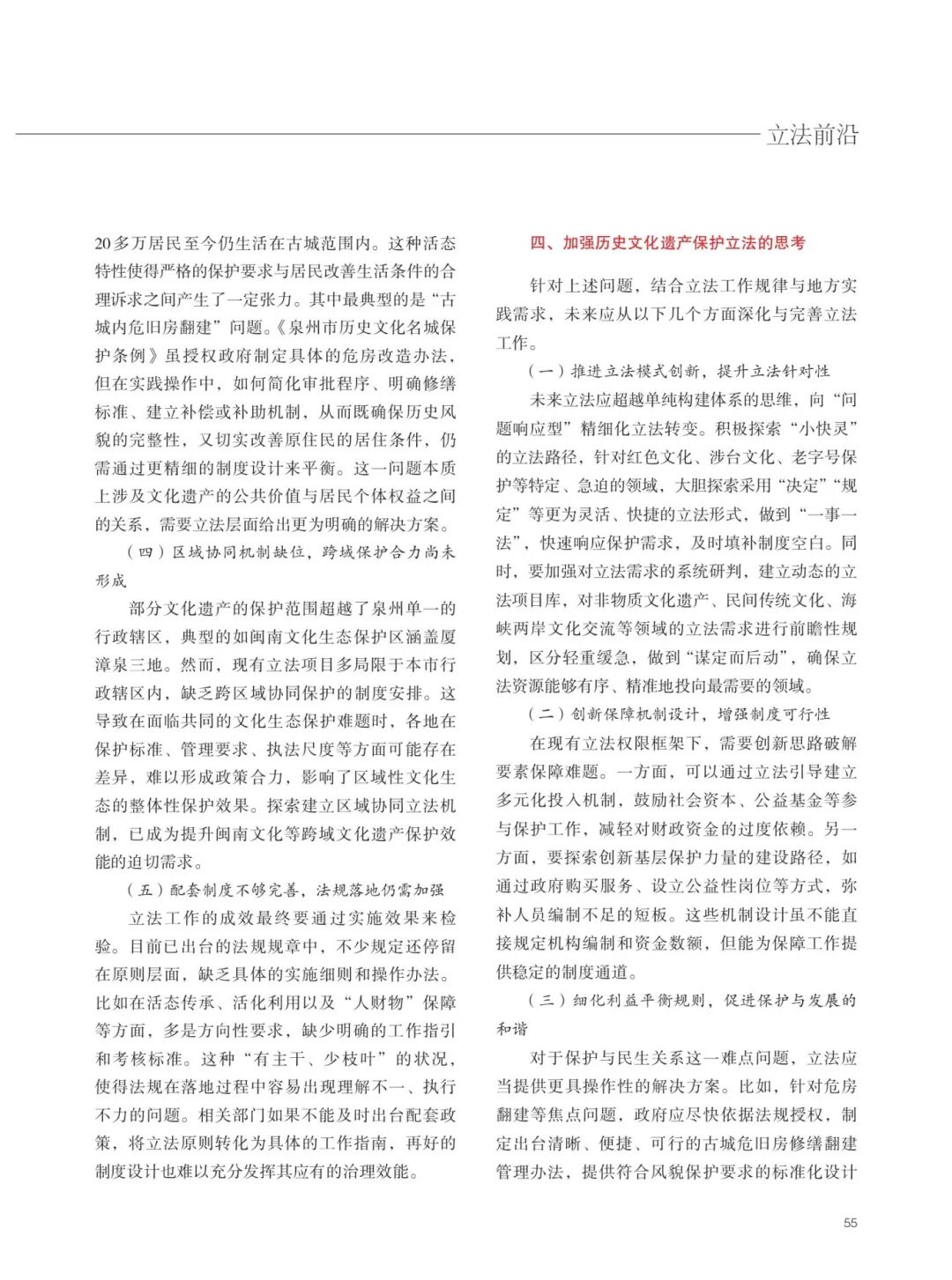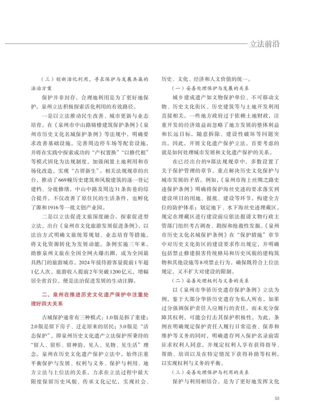 文章系统梳理了泉州自2015年行使地方立法权以来,在文化遗产保护领域的探索历程与实践成果,总结了我市通过9部专项法规规章,逐步构建起覆盖“点、线、面”的历史文化遗产保护法治体系的具体经验。文章深入阐释了处理保护与发展、权利与义务、保护与利用等多重关系的立法思路,并针对当前面临的现实困境,提出了创新立法模式、完善保障机制、细化利益平衡规则等一系列具有实践价值的深化路径。