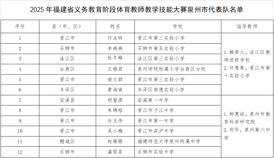 近日,福建省义务教育阶段体育教师技能竞赛落下帷幕,泉州市选派的6名小学、6名初中体育教师代表队实力突围,双双斩获全省总分第一名,包揽小学组、初中组两大组别冠军,尽显泉州体育教师队伍的硬核实力。
