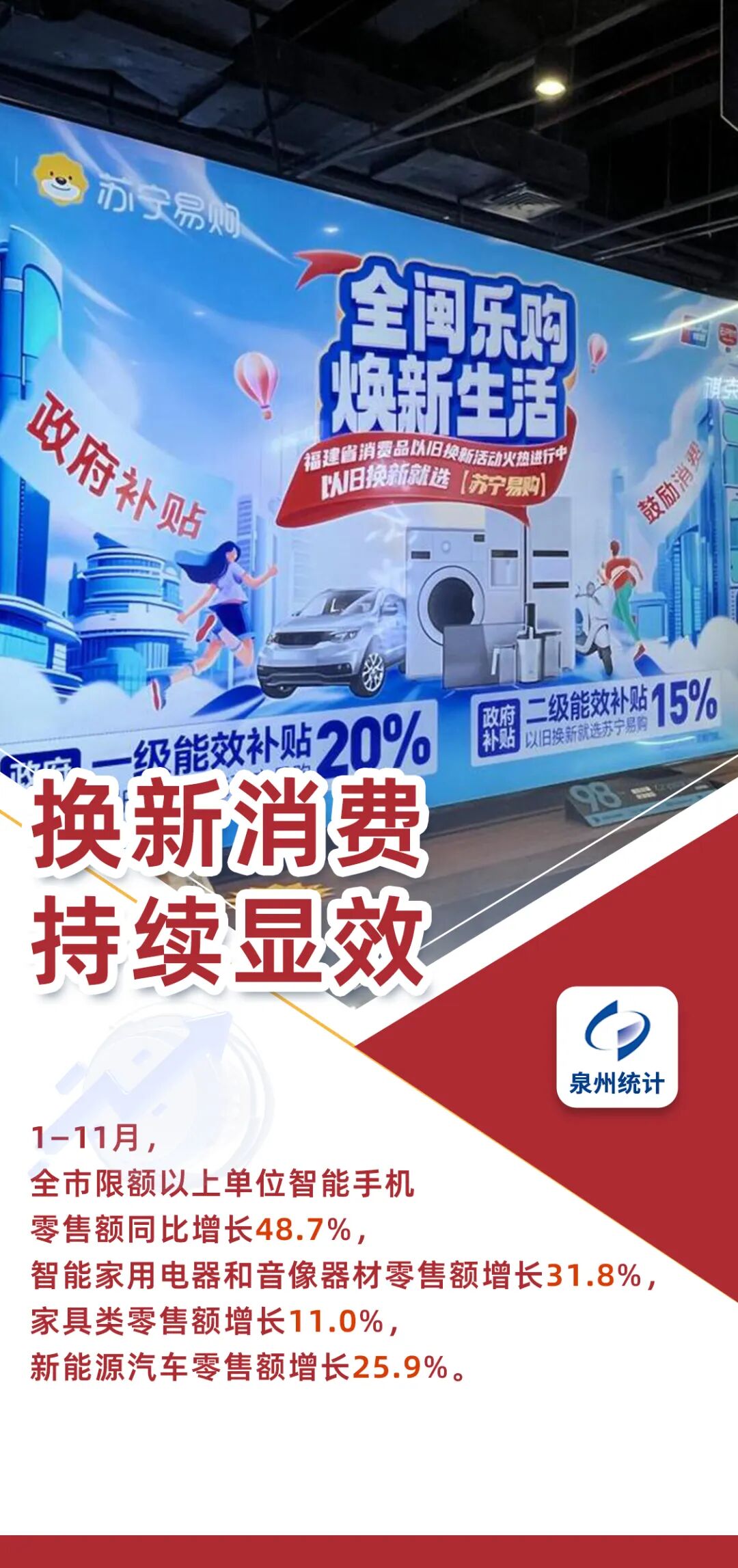 三是换新政策持续显效。1—11月,全市限额以上单位智能手机零售额增长48.7%,智能家用电器和音像器材零售额增长31.8%,家具类零售额增长11.0%,新能源汽车零售额增长25.9%。