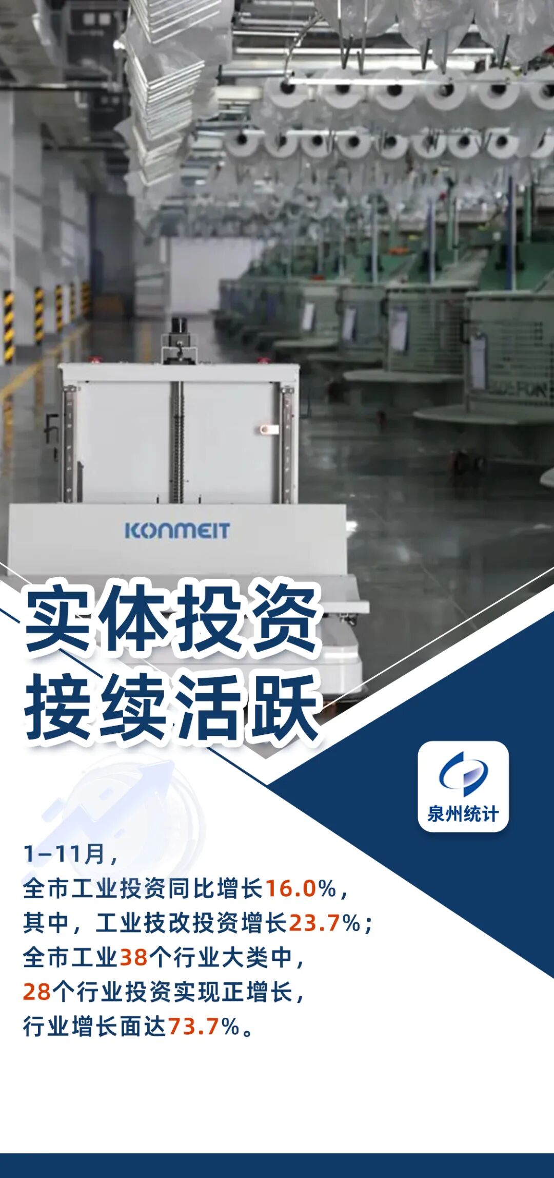 二是工业投资保持增势。1—11月,全市工业投资增长16.0%,其中,工业技改投资增长23.7%;全市工业38个行业大类中,28个行业投资实现正增长,行业增长面73.7%。
