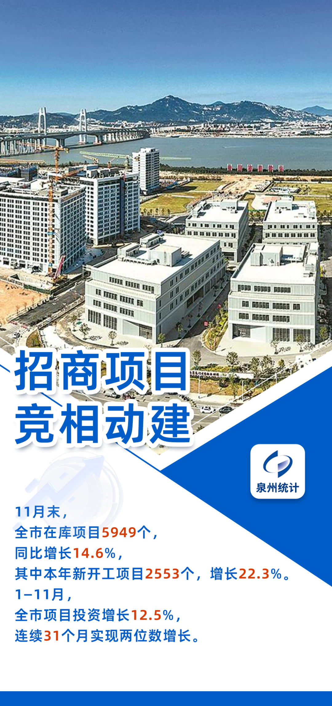 一是招商项目竞相动建。11月末,全市在库项目5949个,增长14.6%,其中本年新开工项目2553个,增长22.3%。