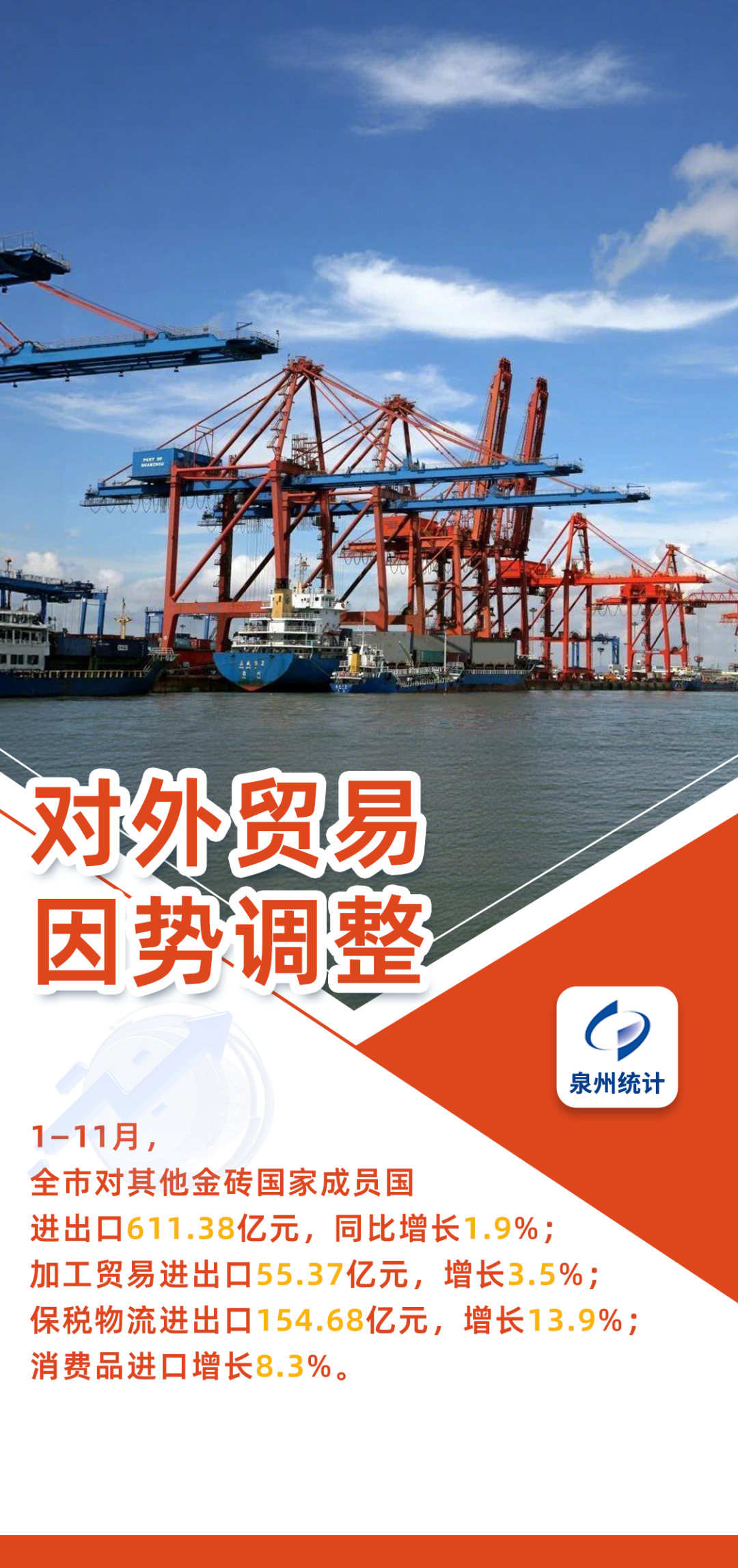 1—11月,泉州市坚持稳中求进工作总基调,完整准确全面贯彻新发展理念,积极服务和融入新发展格局,大拼经济、大抓发展,持续深化拓展“深学争优、敢为争先、实干争效”行动,接续实施“抓项目、促发展”系列专项行动,积极应对外部挑战,全市经济运行总体平稳,高质量发展迈出坚实步伐。