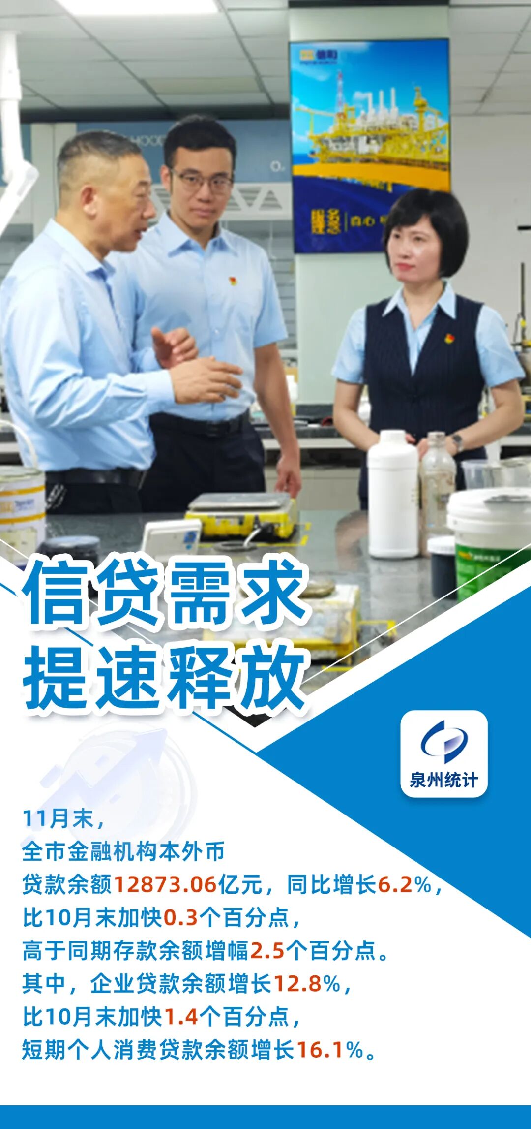 三是信贷投放接续增效。11月末,全市金融机构本外币存款余额13017.71亿元,同比增长3.7%;本外币贷款余额12873.06亿元,增长6.2%,比10月末加快0.3个百分点,高于同期存款余额增幅2.5个百分点。其中,企业贷款余额增长12.8%,比10月末加快1.4个百分点,短期个人消费贷款余额增长16.1%。