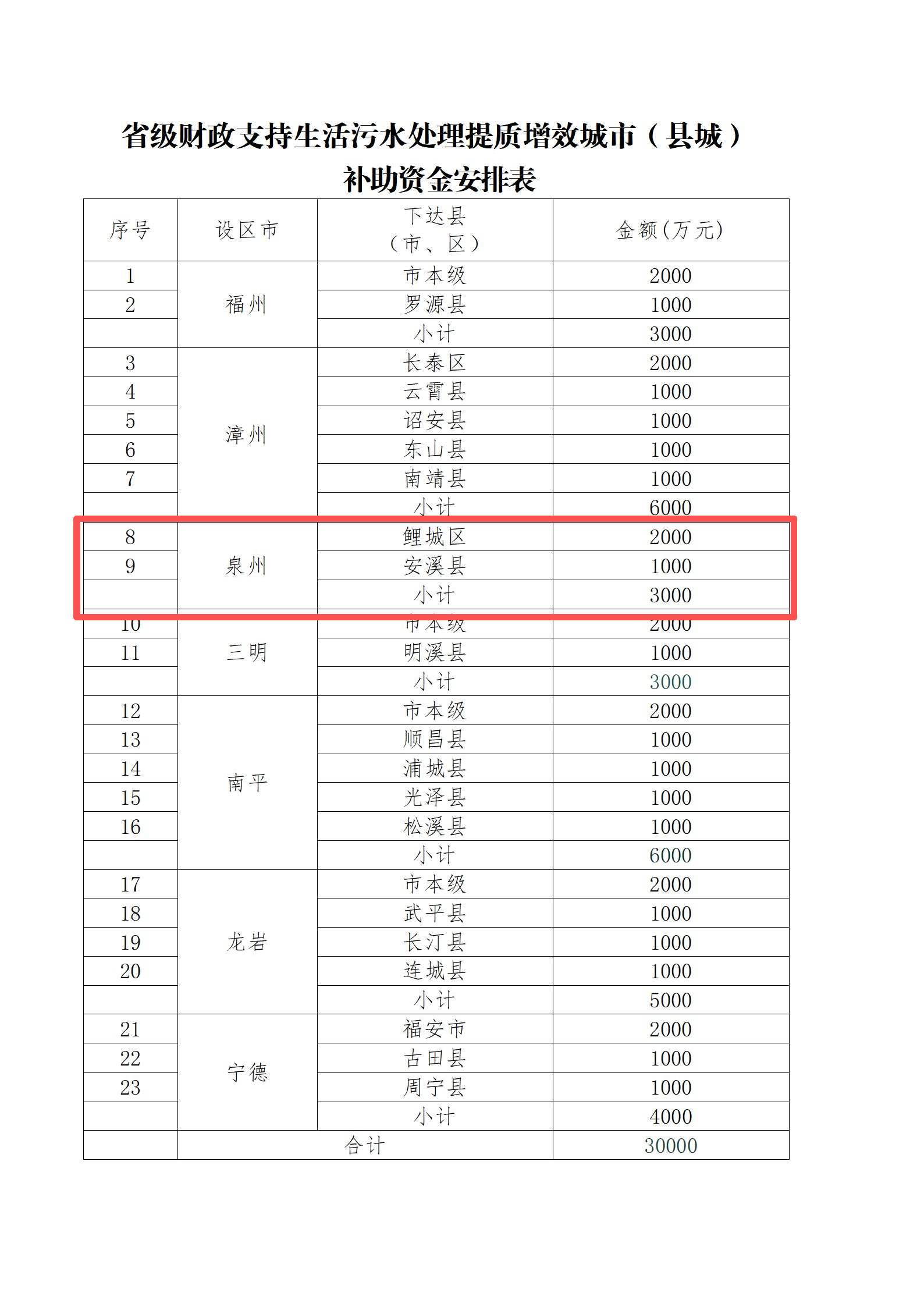 生活污水处理提质增效获补3000万元,重点支持鲤城区、安溪县等地区污水处理设施建设,助力水环境持续改善。