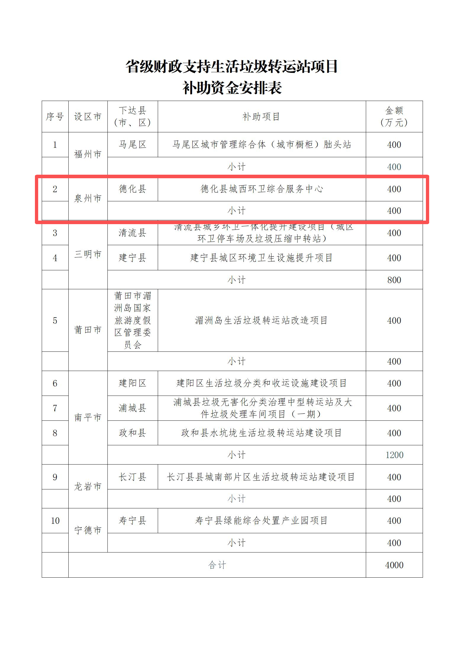 生活垃圾转运站项目补助达400万元,助力德化县域生活垃圾收运处置体系提档升级。