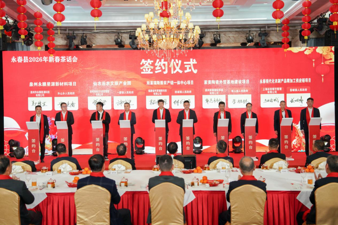 依托春节乡贤返乡“黄金期”,永春县以乡情为纽带、以发展为目标,全力做好招商引资文章。正月初三,隆重举办2026年新春茶话会,与各异地永春商会代表、侨亲代表等欢聚一堂,共叙桑梓情谊、共商发展大计。现场为广州、昆明、北京、长三角、深圳、厦门等首批10个异地商会招商工作联络处授牌,各联络处将成为永春对外招商的“前沿窗口”和项目对接的“服务驿站”。同时,10个重点项目现场签约,涵盖农副产品精深加工、农文旅融合、新材料、新能源等多个领域,为重点产业能级跃升注入强劲新动能。