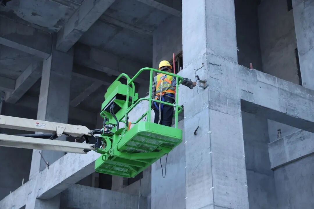 施工现场,塔吊长臂高效运转,物料运输车辆有序穿梭,施工人员正全力开展幕墙焊接作业,焊花飞溅、干劲十足;塔楼内部,电梯安装、管线排布等工序同步交叉作业,各环节衔接紧密、高效推进。