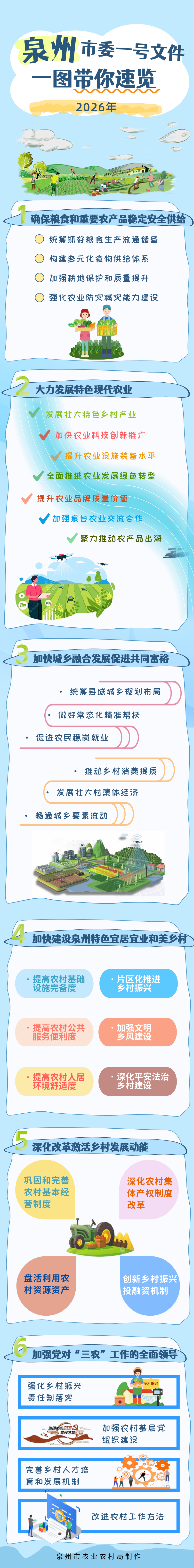 近日,中共泉州市委、泉州市人民政府印发了《关于锚定农业农村现代化 扎实推进乡村全面振兴的实施意见》,文件深入结合泉州实际和特色,对标“十五五”规划编制,围绕确保粮食和重要农产品稳定安全供给、大力发展特色现代农业、加快城乡融合发展促进共同富裕、加快建设泉州特色宜居宜业和美乡村、深化改革激活乡村发展动能、加强党对“三农”工作的全面领导等六个部分31条重点任务,对2026年“三农”工作作了全面部署。
