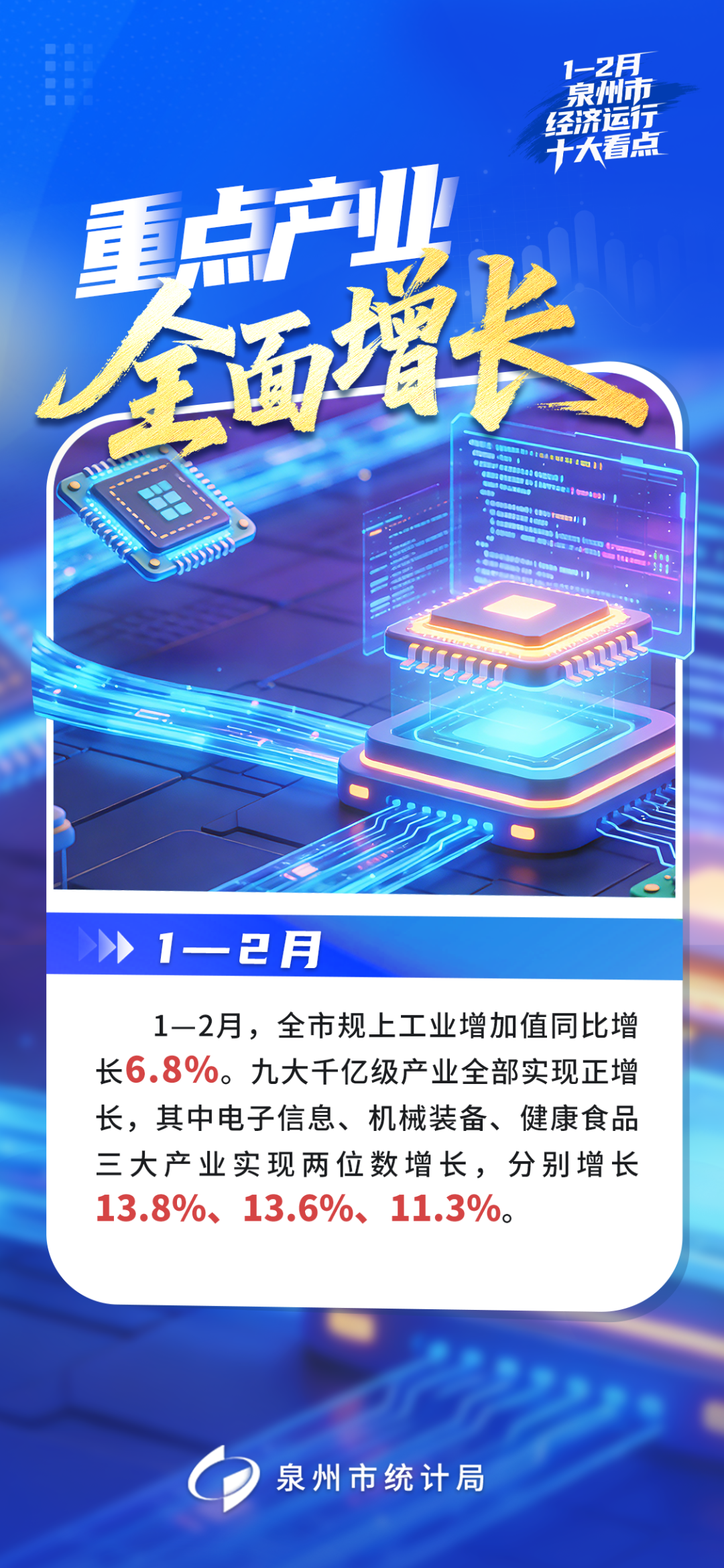 三是新质动能加快集聚。泉州获评全国首批、全省唯一国家新型工业化示范区。1—2月,全市规上高技术产业增加值增长12.6%,比上年全年加快6.4个百分点;计算机、通信和其他电子设备制造业增长14.0%,通用设备制造业增长19.8%。