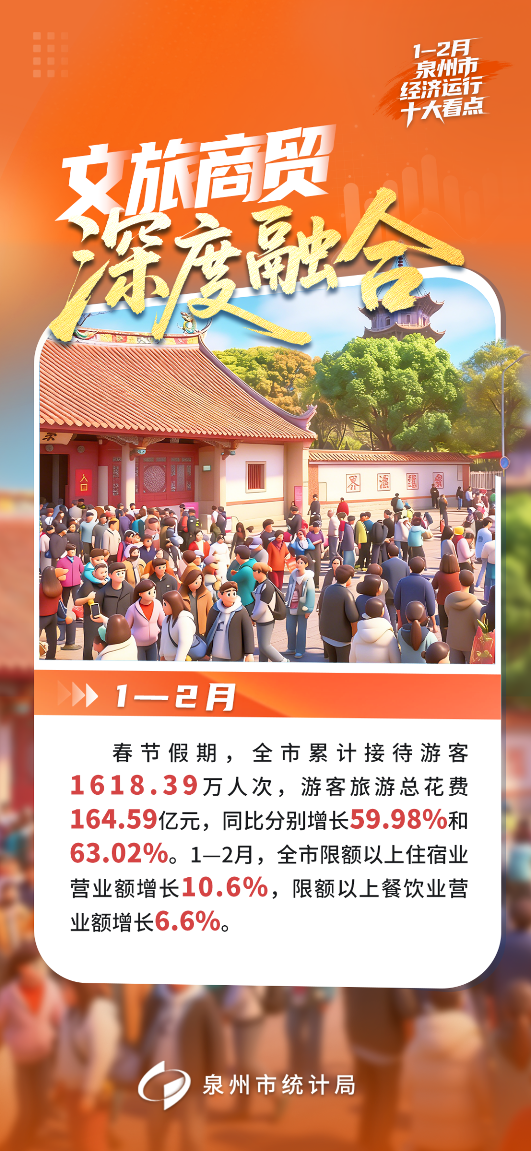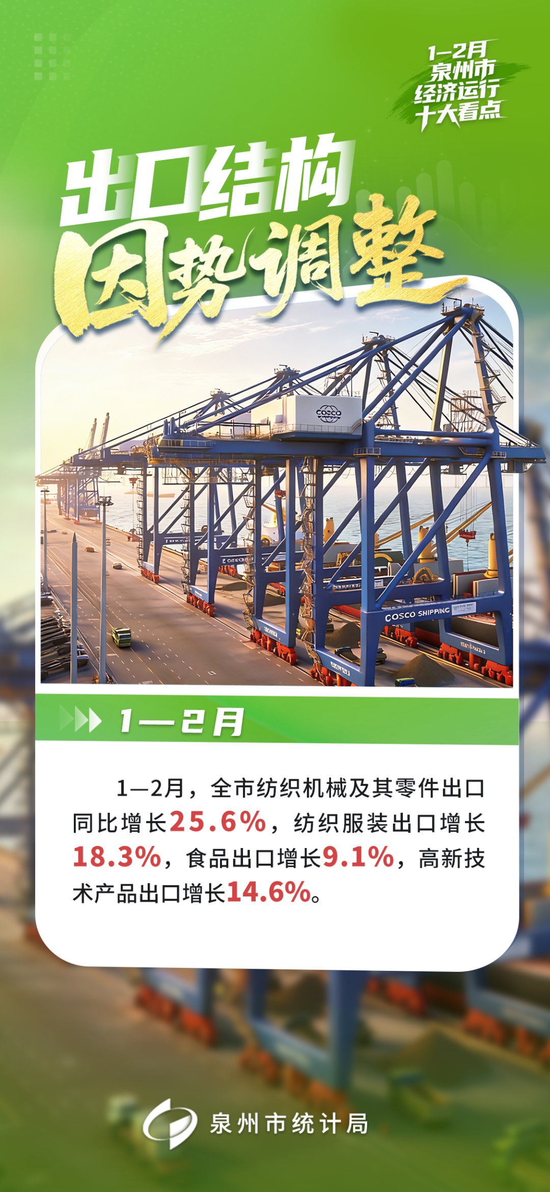 2026年以来,泉州市传承弘扬、创新发展“晋江经验”,坚持稳中求进工作总基调,深入开展“深学争优、敢为争先、实干争效”行动,以“项目巩固年”为抓手,接续实施“抓项目、促发展”系列专项行动,全力大拼经济、大抓发展。1—2月,全市经济运行总体保持平稳,转型升级持续推进,市场需求有序释放,为“十五五”良好开局夯基蓄势。