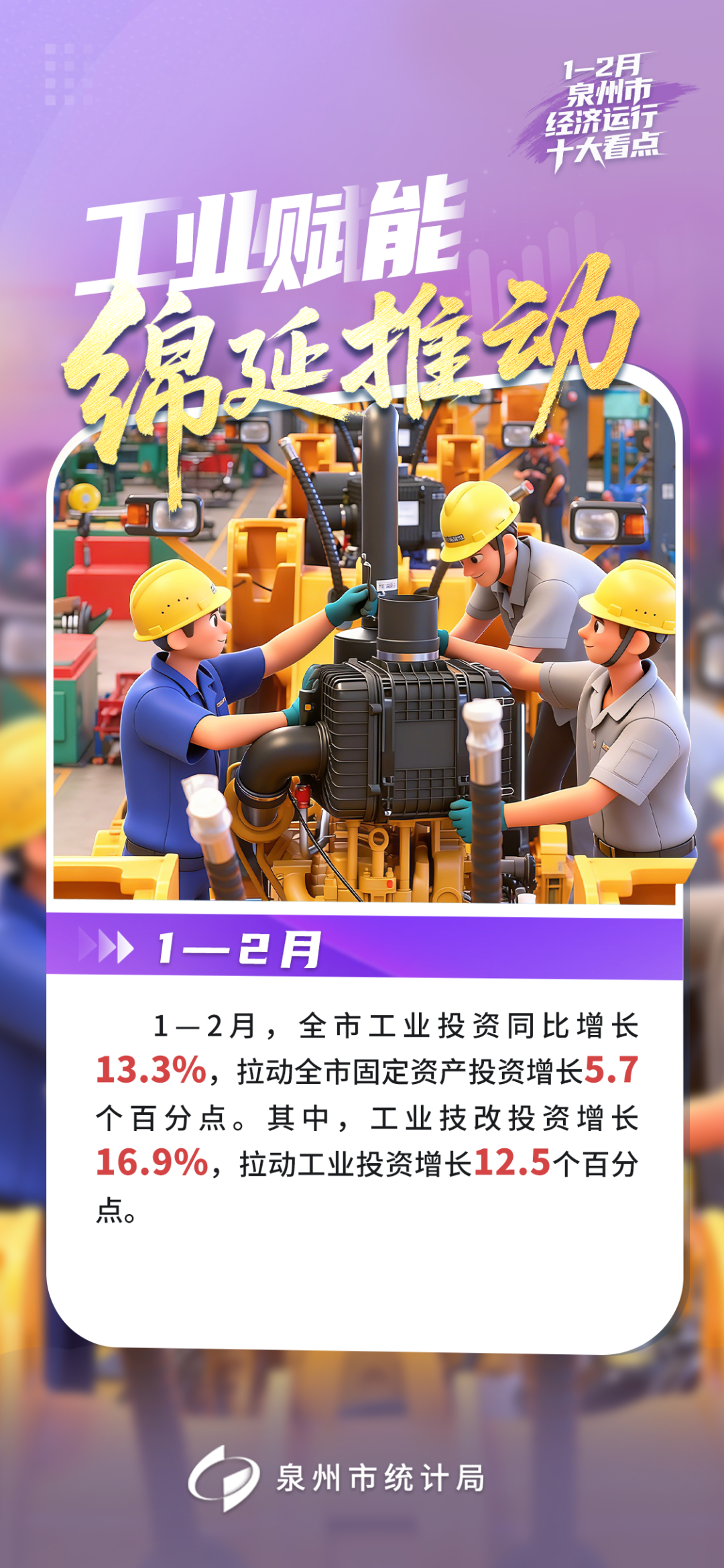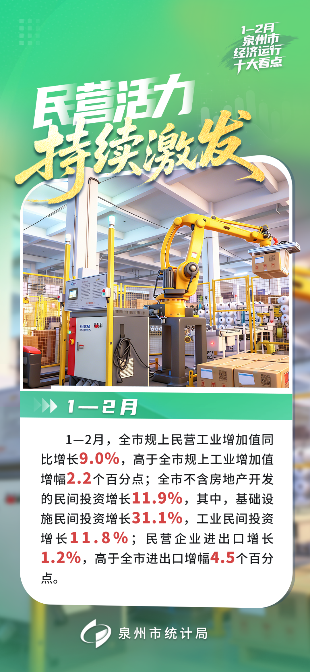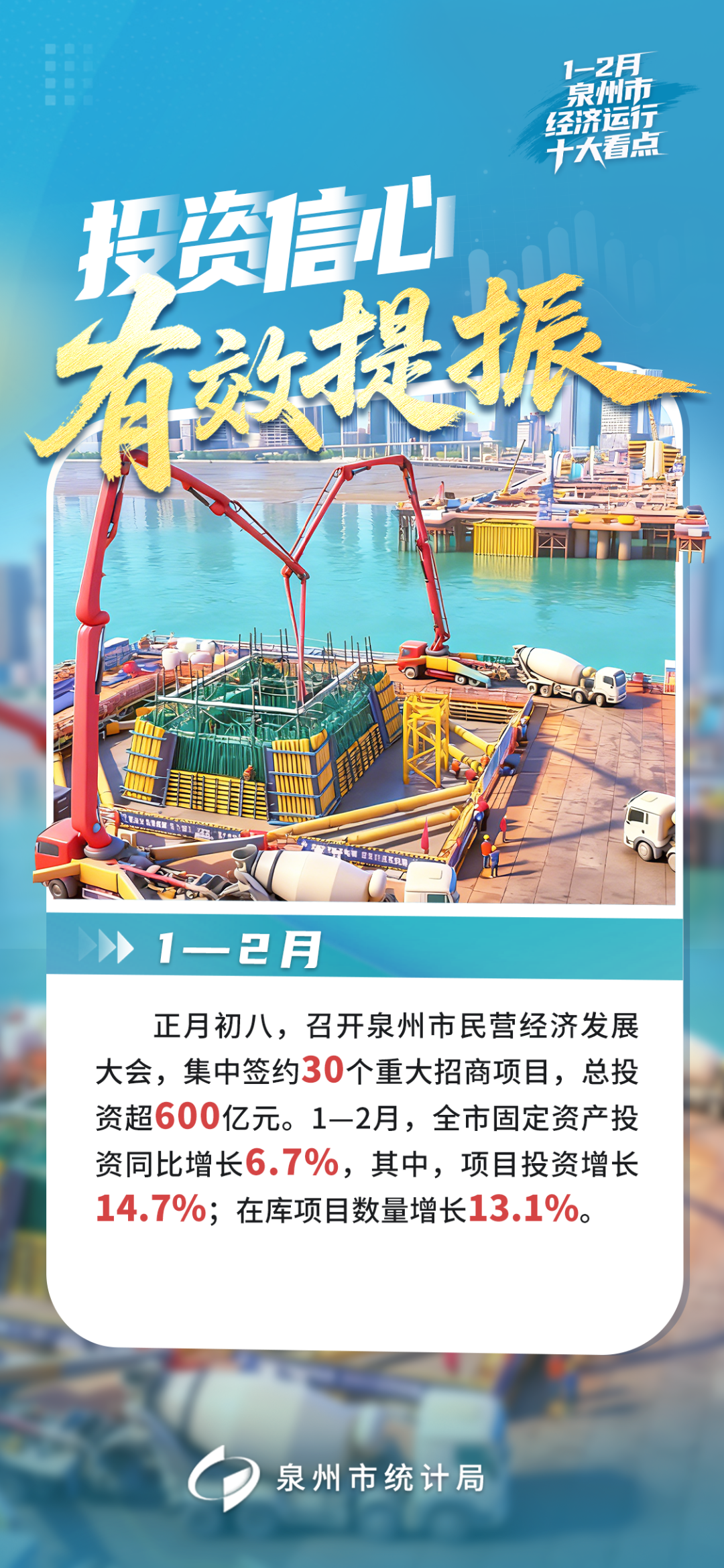 一是项目投资接续发力。正月初八,召开泉州市民营经济发展大会,集中签约30个重大招商项目,总投资超600亿元。1—2月,全市项目投资增长14.7%,在库项目数量增长13.1%。