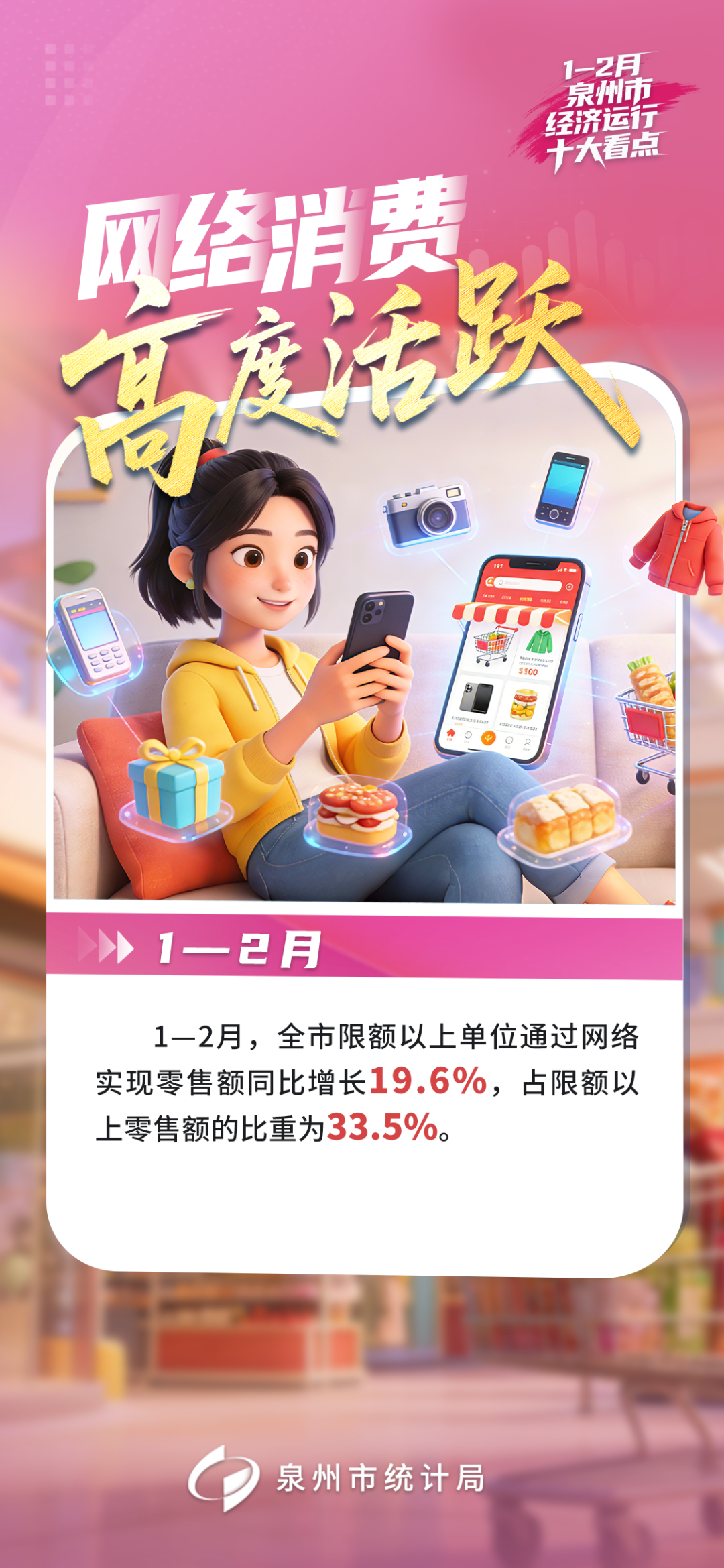 一是网络消费高度活跃。1—2月,全市限额以上单位通过网络实现零售额增长19.6%,占限额以上零售额的比重为33.5%。