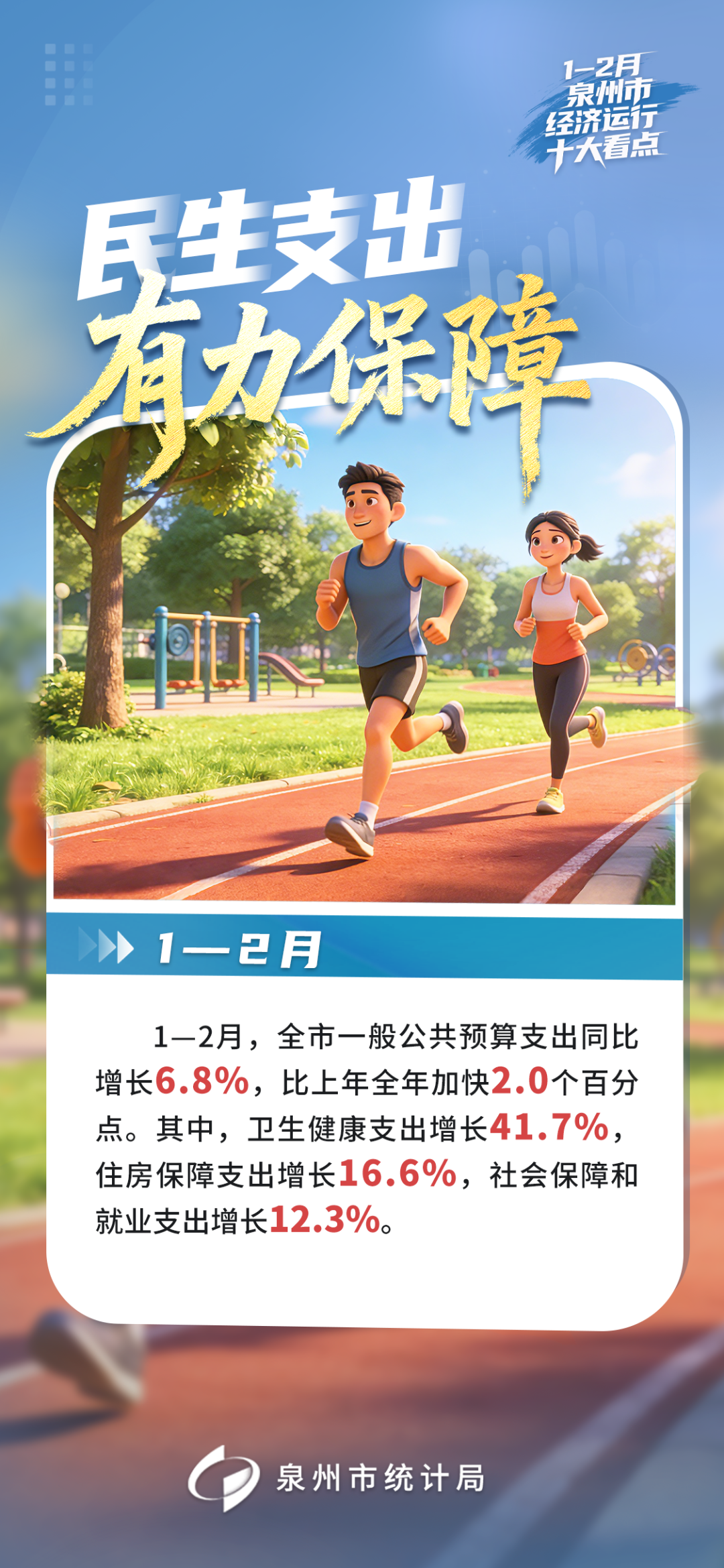 二是民生支出有力保障。1—2月,全市一般公共预算支出增长6.8%,比上年全年加快2.0个百分点。其中,卫生健康支出增长41.7%,住房保障支出增长16.6%,社会保障和就业支出增长12.3%。