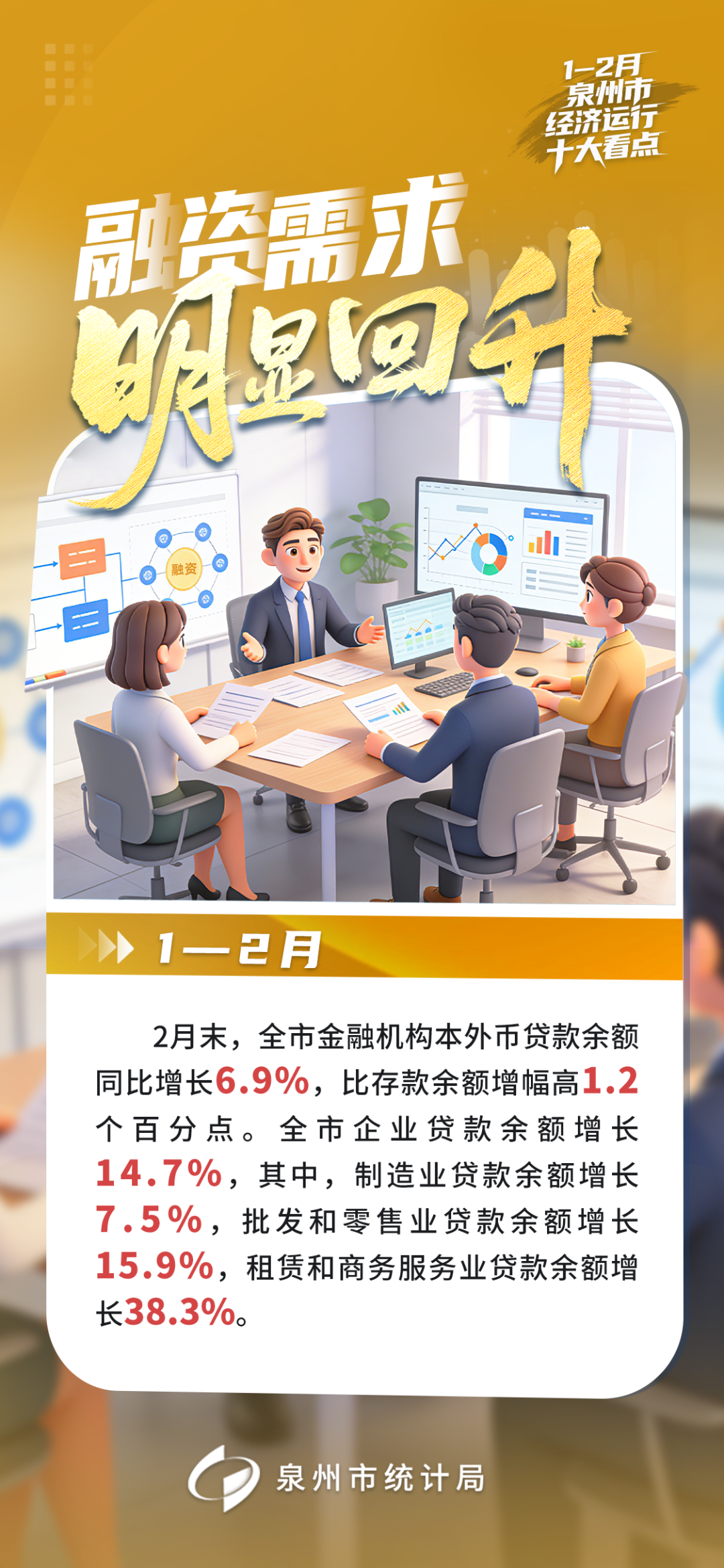 四是实体信贷接续增效。2月末,全市企业贷款余额增长14.7%,其中,制造业贷款余额增长7.5%,批发和零售业贷款余额增长15.9%,租赁和商务服务业贷款余额增长38.3%。