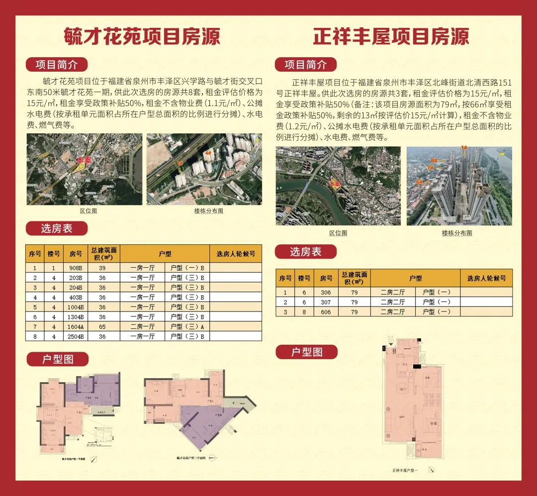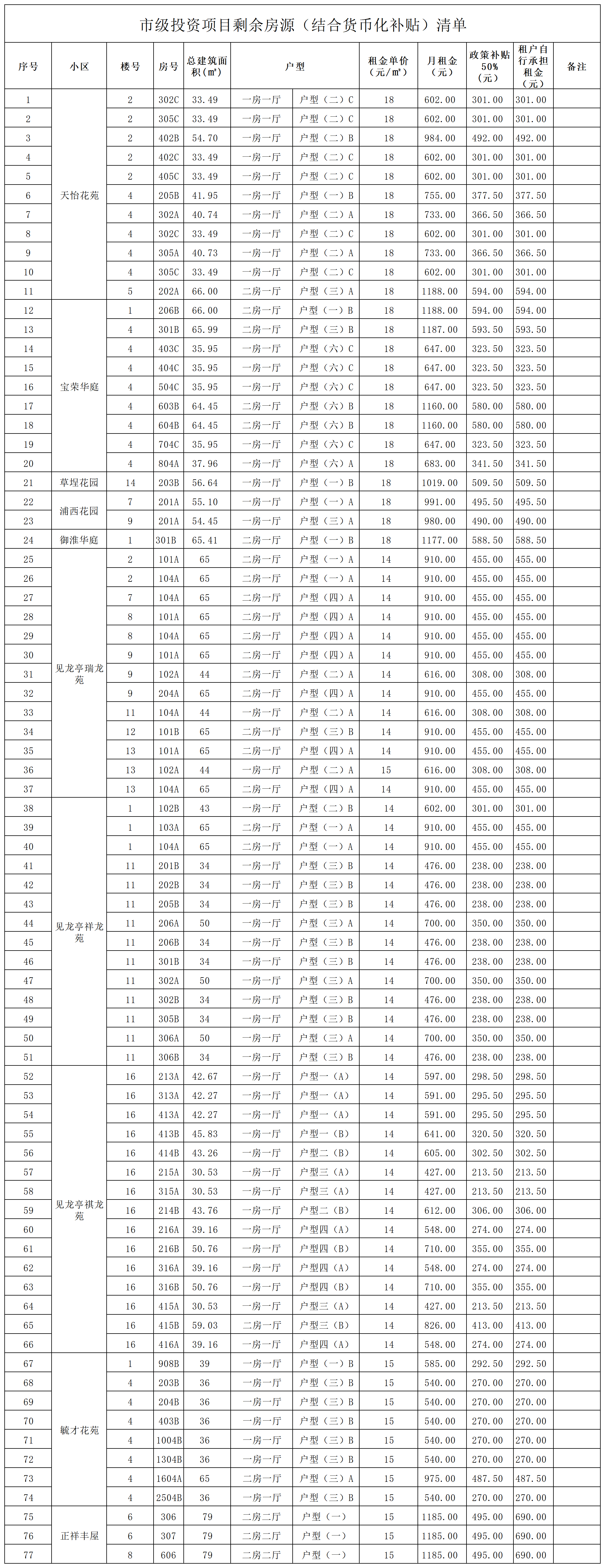 泉州城建城市运营有限责任公司(以下简称市城运公司)筹集的市级投资项目剩余房源(结合货币化补贴)77套(房源清单详见下表)。