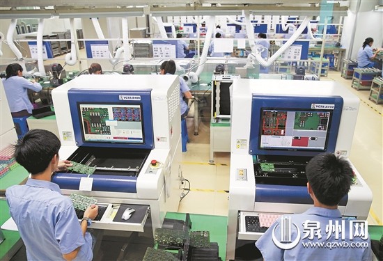 借力智能化设备及生产线,我市企业转型升级步伐加快。近日,在泉州市琪祥电子科技有限公司DIP封装车间内,工人使用智能化的光学检测仪器检测电子元器件的焊接状况,相比以往人工肉眼检测,采用光学检测仪的效率提高了数倍,质量也更有保障。
