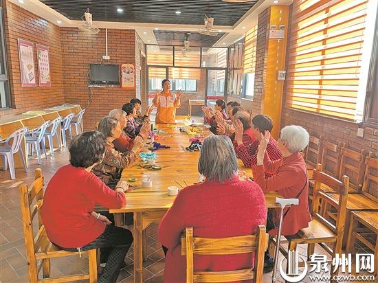 在晋江青阳街道青华社区居家养老服务站,社工组织老年人做手工。