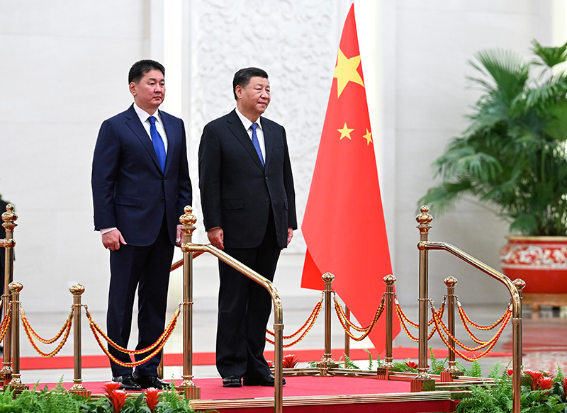 会谈前,习近平在人民大会堂北大厅为呼日勒苏赫举行欢迎仪式。天安门广场鸣放21响礼炮。两国元首登上检阅台,检阅中国人民解放军仪仗队。