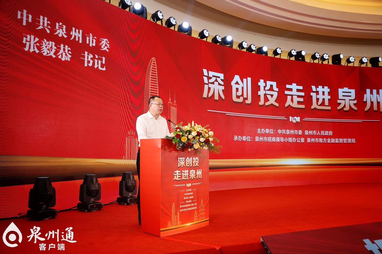 张毅恭对深创投以“发现并成就伟大企业”为使命,坚持“国家需要什么就投什么”,资本赋能企业成长表示敬意,向来泉考察的企业家表示欢迎。他说,泉州是习近平总书记亲自总结推广的“晋江经验”发源地,拥有坚实的产业基础,民营经济是最大特色和最大优势。全市上下牢记嘱托、感恩奋进,完整、准确、全面贯彻新发展理念,积极服务和融入新发展格局,勇当实施新时代民营经济强省战略主力军。我们全力大拼经济、大抓发展,坚持制造业立市,把招商引资作为战略性先导工程,吸引侨商泉商回归投资,做大做强产业基金体系,加快构建现代化产业体系。同时,抢抓国家盘活利用低效用地试点,加快工业园区标准化提升,规划建设泉州南翼国家高新区,加速汇聚半导体、新能源、新材料、人工智能、生物医药等新赛道,打造战略性新兴产业高地。泉州新一轮高质量发展蕴藏无限机遇,与深创投的合作,一定能打开广阔的前景、释放强大的动力。真诚希望大家多走走看看,认识泉州、选择泉州、深耕泉州,与泉州共同成长、互相成就。泉州将全力打造市场化法治化国际化一流营商环境,建立专班、统筹协调,以最大诚意、最优服务、最好政策,让基金在泉州放心投、让企业在泉州安心干。