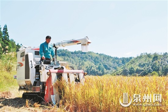 时下正是秋收季节,我市各地农民在田间地头又忙碌了起来。与往年不一样的是,在德化县杨梅乡云溪村的农田里,很少看到农民弯腰割稻的背影,取而代之的是一台台自动化收割机在金色的稻浪里穿行。据了解,依托山海协作机制,石狮市与德化县全省首创,携手在这里建设一个面积680亩的水稻生产全程机械化示范基地,作为石狮市的“飞地粮仓”。