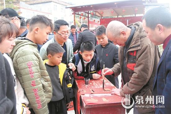 贴春联,是过年必不可少的年俗。当天活动一开始,戏台旁的观众席后方就摆好了多张桌子,来自泉州、永春等地的书法家们,摆上笔墨纸砚,开始为村民们义务写春联。