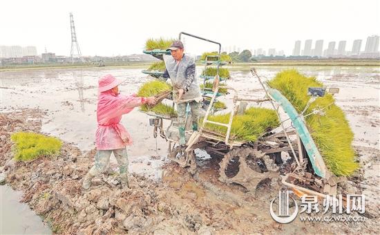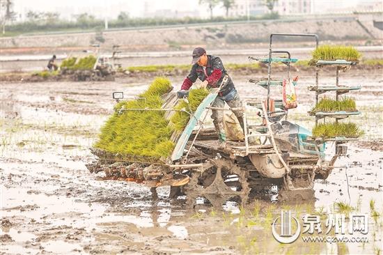 眼下正是水稻插秧时节,昨日,记者在晋江九十九溪流域田园风光拓展区“五彩稻田”项目现场看到,2台插秧机正在水田里来回穿梭,有序地插播今年的第一批秧苗。“五彩稻田”项目负责人、晋江农情文化传媒有限公司董事长洪良彬告诉记者,2台插秧机一天可完成100亩左右的水稻插秧任务,省时省力,还能提高水稻产量。