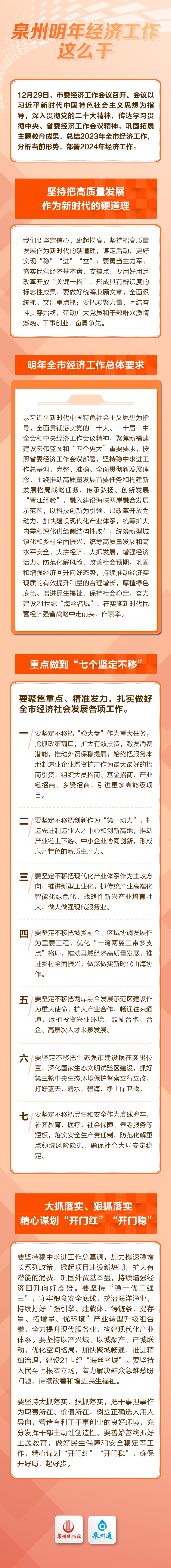 会议强调,明年经济工作的总体要求是,以习近平新时代中国特色社会主义思想为指导,全面贯彻落实党的二十大、二十届二中全会和中央经济工作会议精神,聚焦新福建建设宏伟蓝图和“四个更大”重要要求,按照省委经济工作会议部署,坚持稳中求进工作总基调,完整、准确、全面贯彻新发展理念,围绕推动高质量发展首要任务和构建新发展格局战略任务,传承弘扬、创新发展“晋江经验”,融入建设海峡两岸融合发展示范区,以科技创新为引领,以改革开放为动力,加快建设现代化产业体系,统筹扩大内需和深化供给侧结构性改革,统筹新型城镇化和乡村全面振兴,统筹高质量发展和高水平安全,大拼经济、大抓发展,增强经济活力、防范化解风险、改善社会预期,巩固和增强经济回升向好态势,持续推动经济实现质的有效提升和量的合理增长,厚植绿色底色、增进民生福祉、保持社会稳定,奋力建设21世纪“海丝名城”,在实施新时代民营经济强省战略中走前头、作表率。