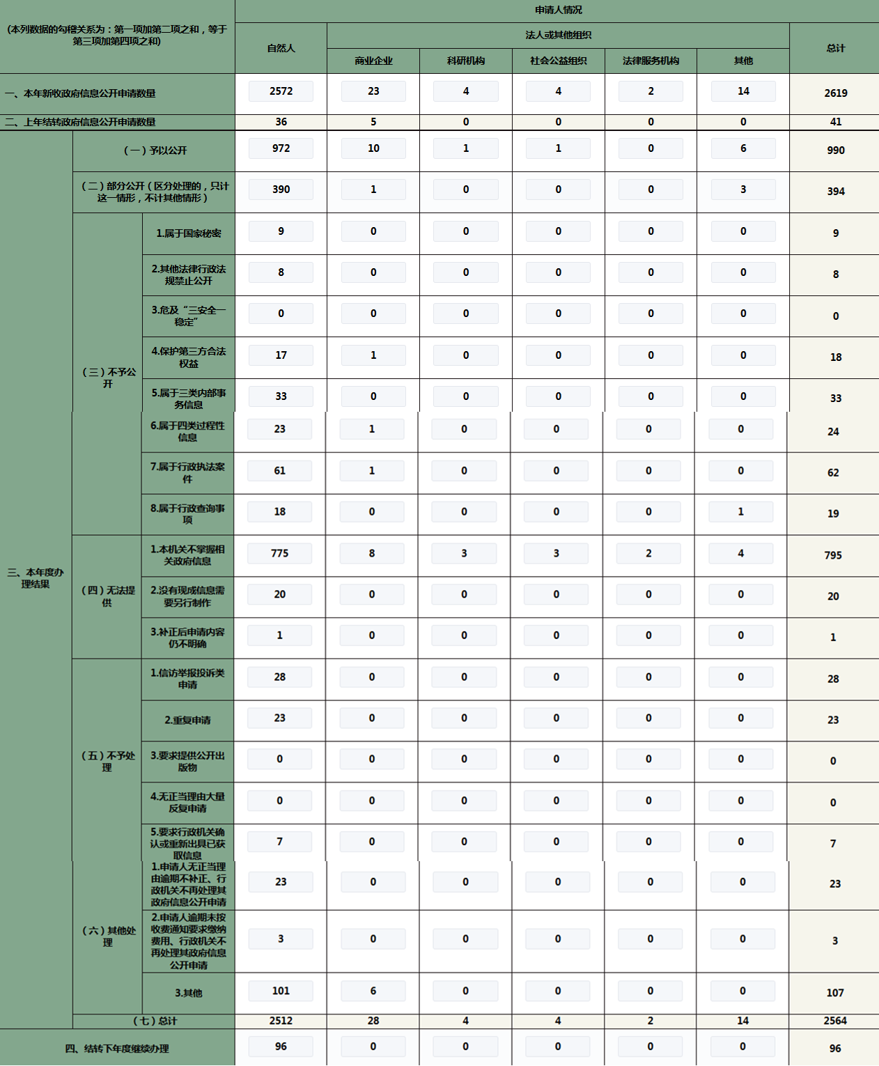 依法规范办理依申请公开事项,保障公众合理信息需求。申请数量平稳增长,全年共收到政府信息公开申请2619件,其中,自然人申请2572件,商业企业申请23件,科研机构申请4件,社会公益组织申请4件,法律服务机构申请2件,其他申请14件,申请件均及时受理,并在法定期限内完成答复工作,本年度受理的依申请案件涉及有关土地征收、规划许可、财政资金使用、行政处罚等高频领域。