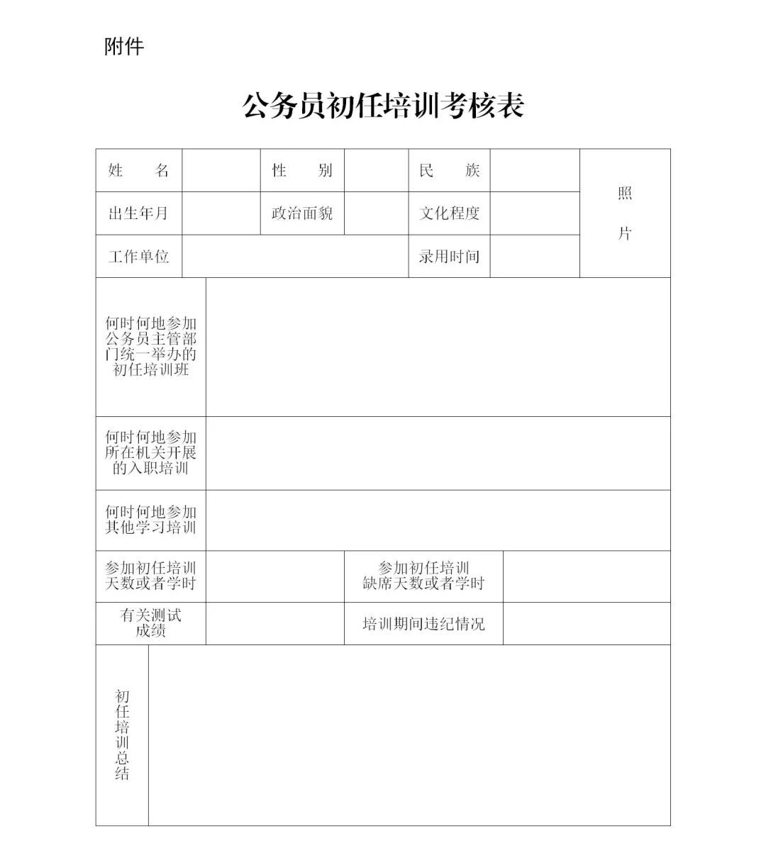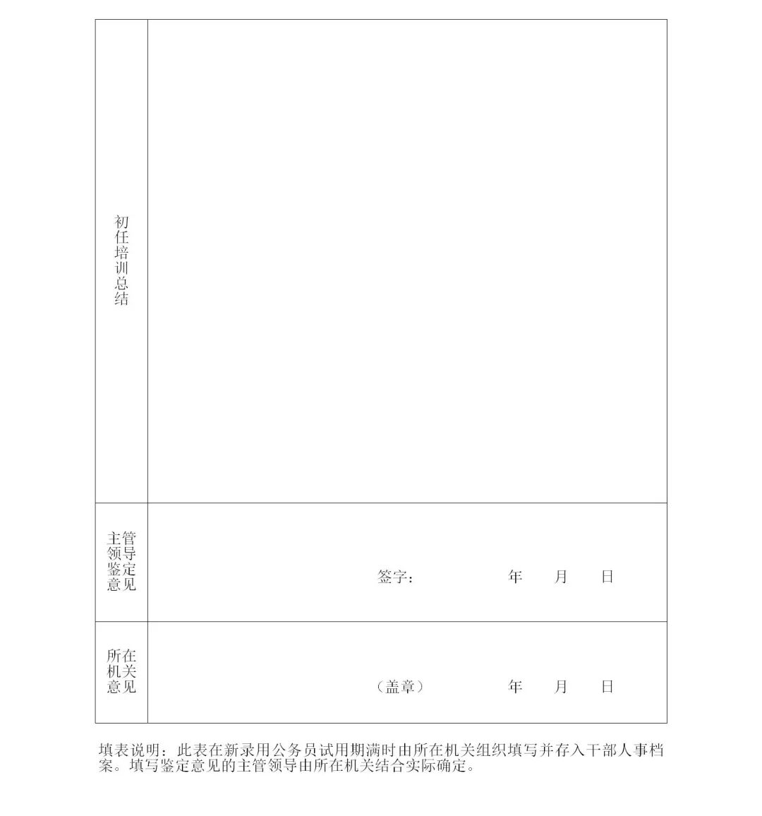 完善初任培训登记制度,新录用公务员试用期满时由所在机关组织填写《公务员初任培训考核表》(见附件)并存入干部人事档案。