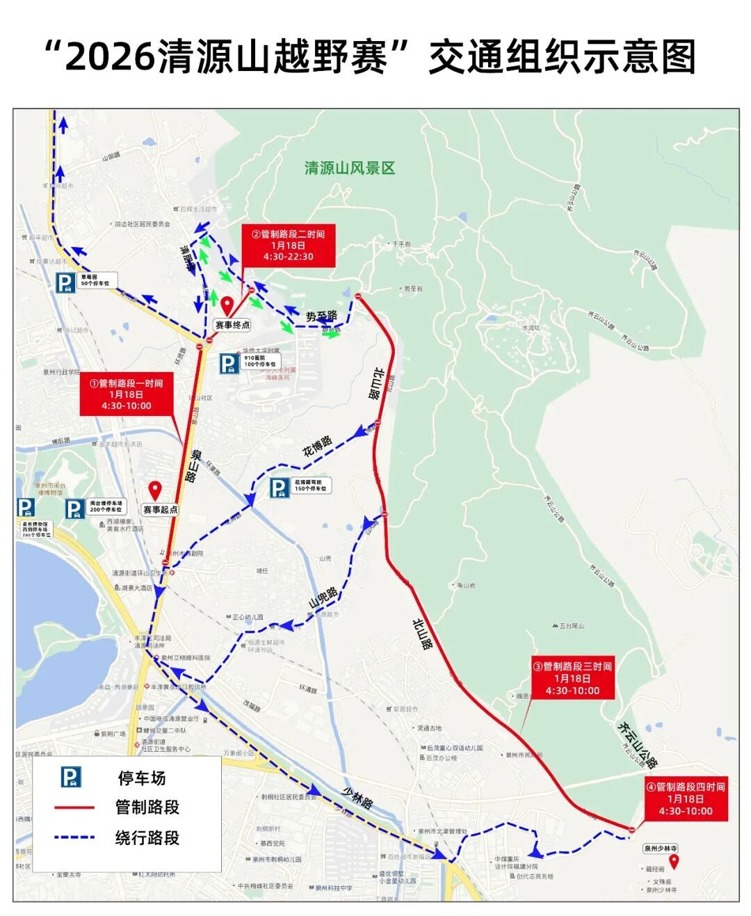 2026清源山越野赛将于1月18日在清源山风景区举办,为确保赛事期间辖区道路交通安全、有序、畅通,根据《中华人民共和国道路交通安全法》第三十九条规定,交警丰泽大队将于比赛当日根据道路交通实际情况,适时对泉山路、北山路、齐云山公路等周边道路实行临时交通管制。比赛期间将对部分道路采取分时、分段交通管制措施。管制措施如下: