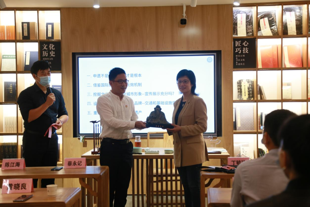 讲座结束后,清源山风景名胜区党工委书记、管委会主任蔡永记代表清源山风景区向丁毓玲赠送清源山老君复刻文创品。据悉,此尊老君复刻文创品以世遗点之一的老君岩造像为原型,复刻而成,代表了清源山的核心元素和文化。