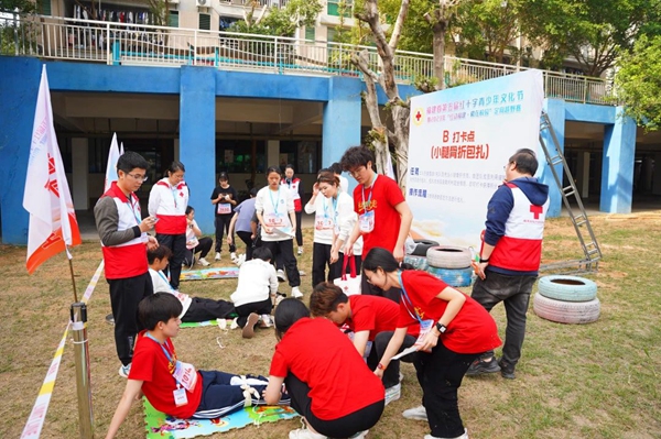 比赛当日,晋江市红十字会选派16名志愿培训师资,在活动4个互动必打卡点位(手臂创伤救护包扎、小腿骨折包扎、海姆立克急救法、心肺复苏+AED操作)对选手们进行专业评判。