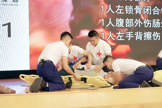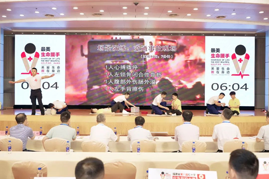大赛分理论知识笔试、救护技能操作和模拟场景演练三个竞赛环节。特别是模拟场景演练,以交通事故、触电、地震、踩踏、火灾、运动伤害等灾害事故为背景,模拟现场救援救护行动,向公众传授心肺复苏和AED使用、气道异物梗阻的现场急救、创伤止血、包扎、骨折固定等救护知识和技能,极大考验了参赛队员的熟练运用技能、科学处置伤患的综合能力。