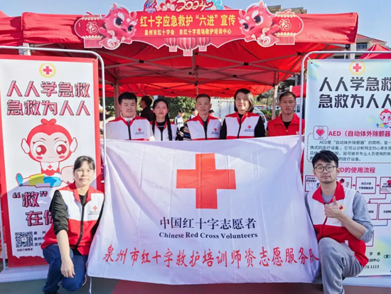 在展区前,泉州市红十字会和泉州市红十字现场救护培训中心以及安溪县红十字会工作人员和志愿者,身穿“红博娃”人偶和红十字志愿者马甲,广泛传播“人道、博爱、奉献”的红十字精神,通过悬挂横幅、设立宣传咨询台,发放造血干细胞知识手册、心搏骤停救生技术CPR与AED应用手册、器官捐献和无偿献血宣传小折页、红博娃钥匙扣等方式,现场为群众普及红十字知识、应急救护小常识,讲解心肺复苏的基本操作和急救方法,与群众进行面对面的沟通交流,提升民众健康素养。据悉,活动现场,泉州市红十字会还向安溪县蓬莱镇赠送10个急救箱,为干部群众生命健康保驾护航。