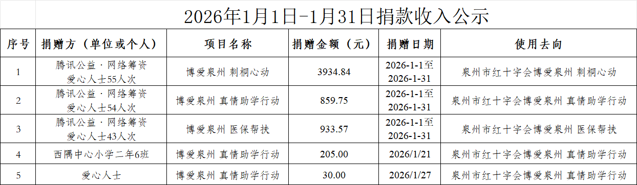 2026年1月1日-1月31日捐款收入公示