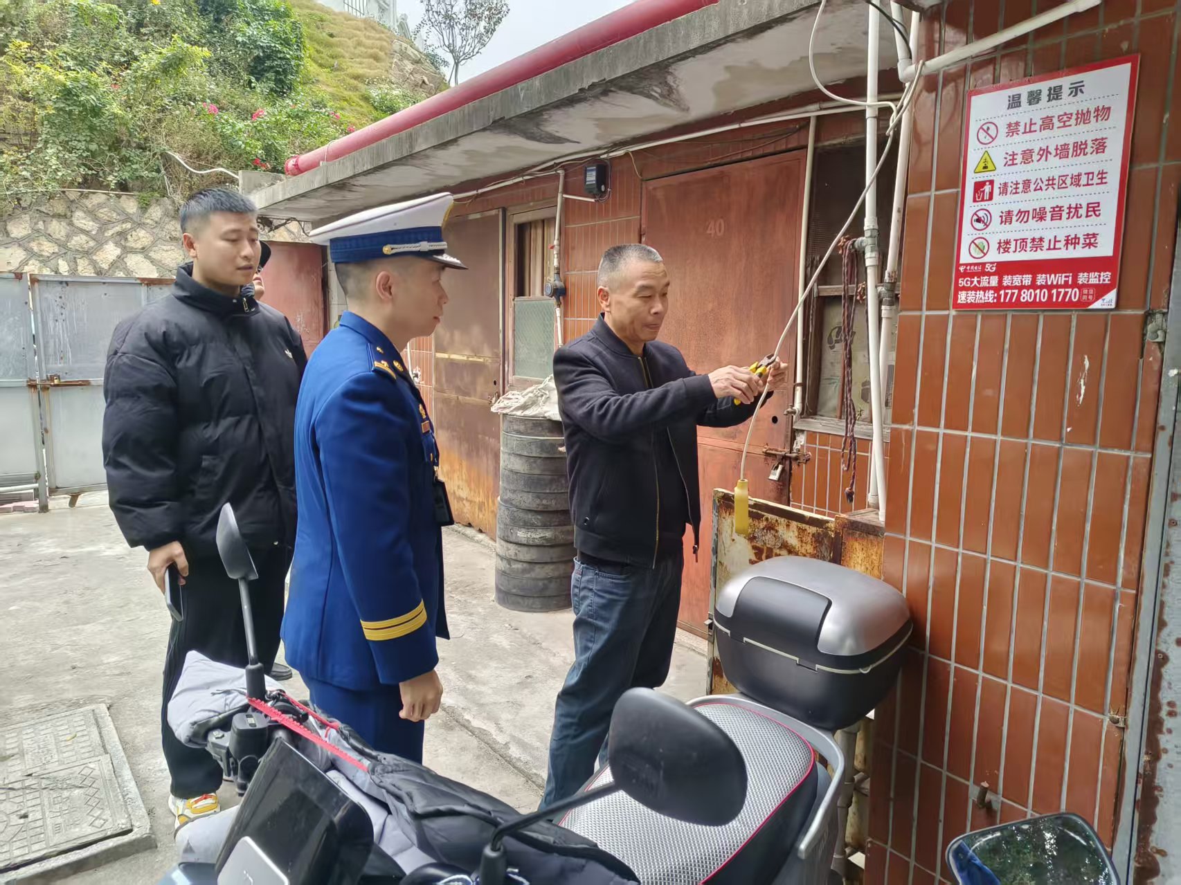 检查中,检查人员发现“飞线”充电这一屡禁不止的问题再次凸显,不少住户从高层私拉电线至地面为电动自行车充电。这类线路长期暴露在外,极易因老化、接触不良引发短路起火。检查人员当即对违规线路进行拆除,张贴提醒纠正单,作出严正警告。