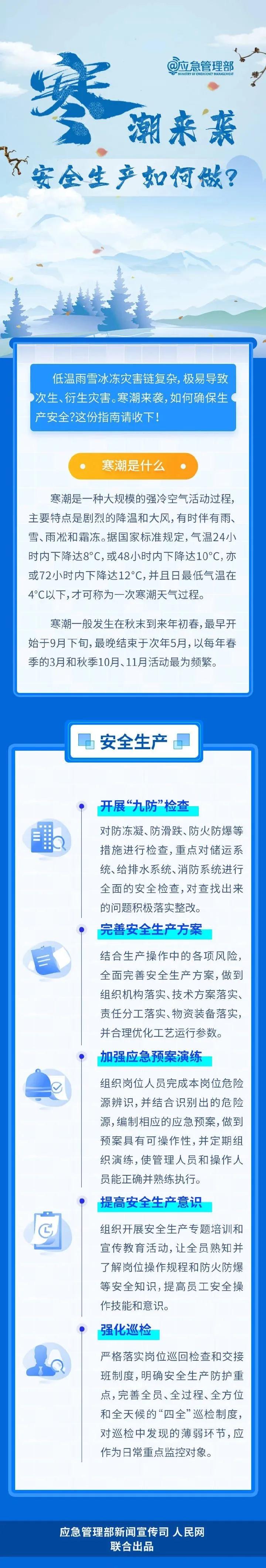 寒潮是一种大规模的强冷空气活动过程,主要特点是剧烈的降温和大风,有时伴有雨、雪和霜冻等。低温雨雪冰冻灾害链复杂,极易导致次生、衍生灾害。寒潮来袭,如何确保生产安全?这份指南请收下!