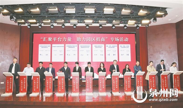 汇聚平台力量,助力园区招商。在昨日的平台招商专场活动上,包括深圳投石产业公司、深圳无线电行业协会、深圳前瞻产业研究院、招商局资本管理公司、谷川联行公司、深企投产业发展公司、润城新产业公司在内的7家招商机构现场分别与泉州鲤城、丰泽、洛江、南安、永春、台商投资区签订合约,以政企合作、园企共建的模式,共同推进当地工业园区招商活动。