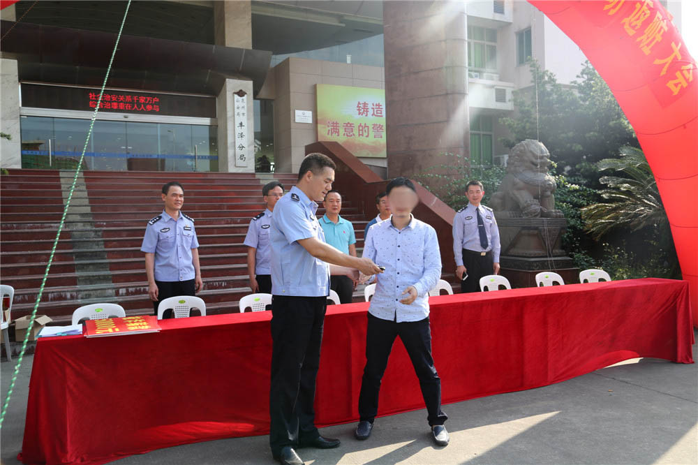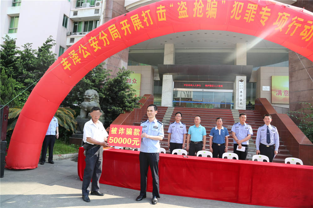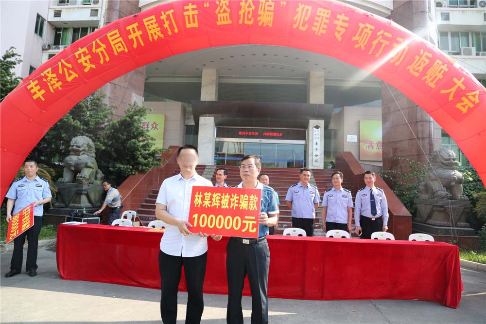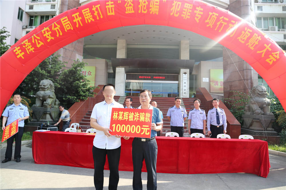 5月9日,丰泽分局在一楼大院召开打击“盗抢骗”犯罪专项行动返赃大会。副区长、公安分局局长朱长沙,副局长陈大强、庄辉煌,党委委员、刑侦大队长陈乘顺将追缴的涉案赃款、赃车返还给群众。
