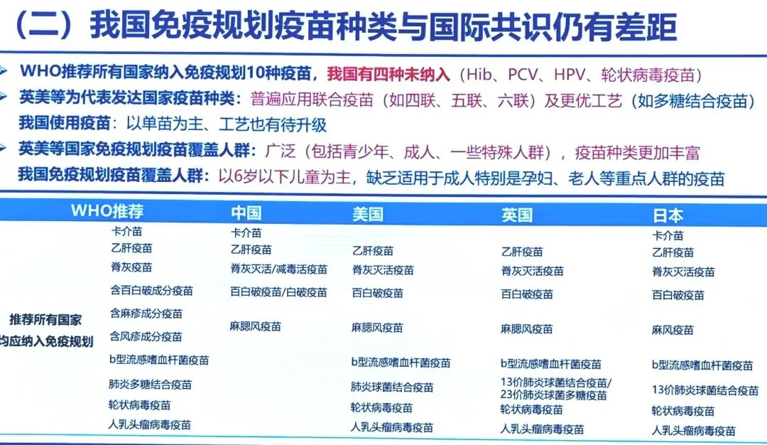 沈洪兵展示的PPT显示,WHO推荐所有国家纳入免疫规划10种疫苗,中国有四种未纳入(Hib、PCV、HPV、轮状病毒疫苗)。